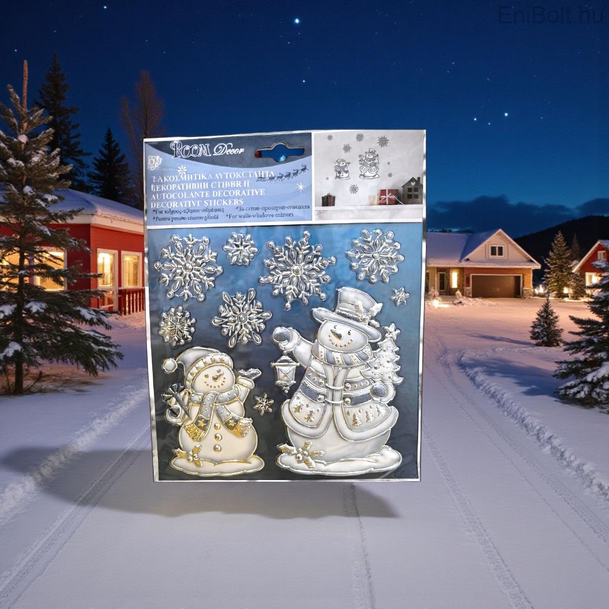 Kezdőlap » Karácsonyi dekorációk » Karácsonyi matricák » Karácsonyi matrica hóember lámpákkal és ezüst pelyhekkel 18x23cm