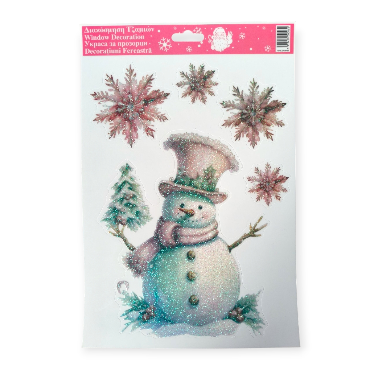 Kezdőlap » Karácsonyi dekorációk » Karácsonyi matricák » Karácsonyi matricák hóember és pelyhek rózsaszín csillámmal 20x27 cm