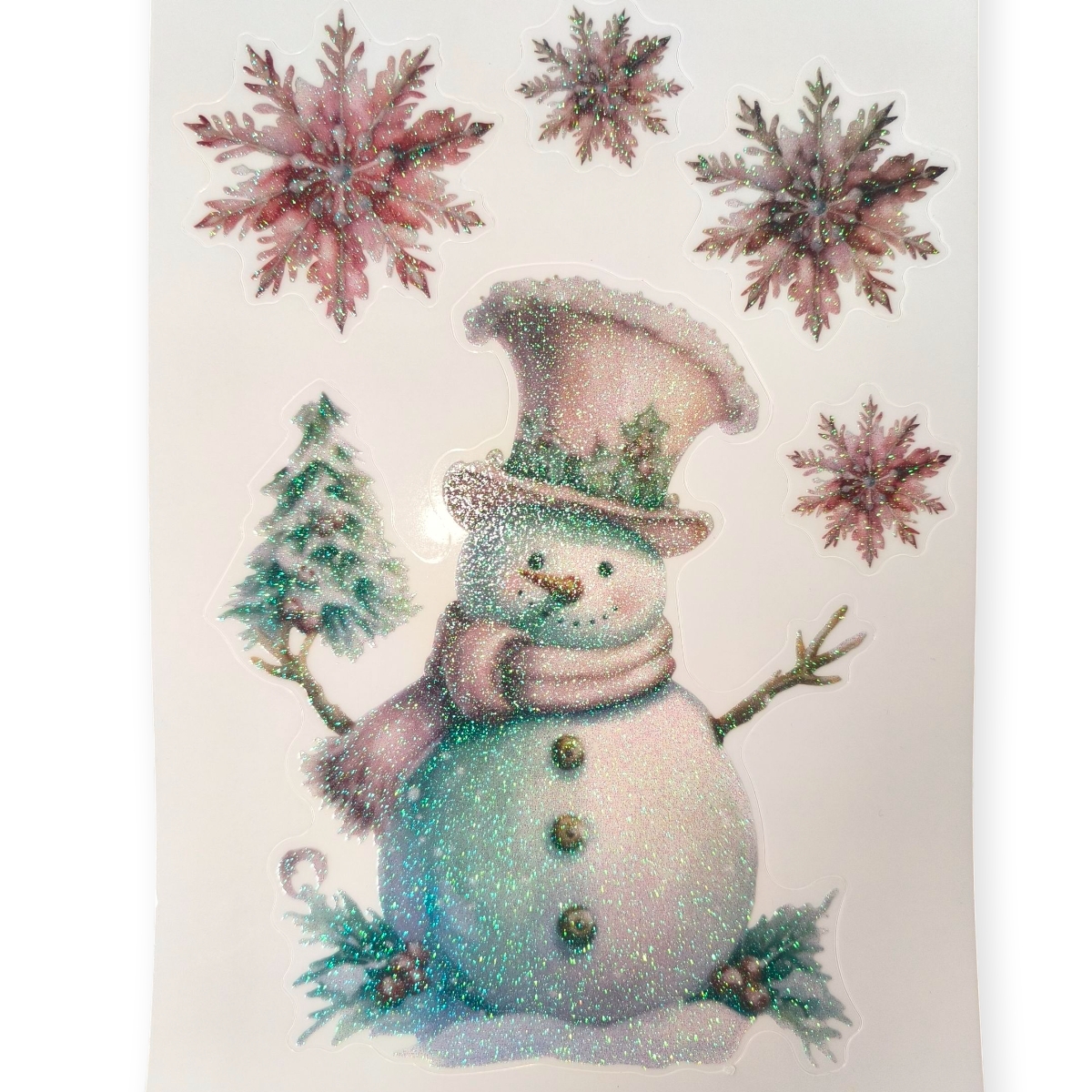 Karácsonyi matricák hóember és hópelyhek rózsaszín csillámmal
