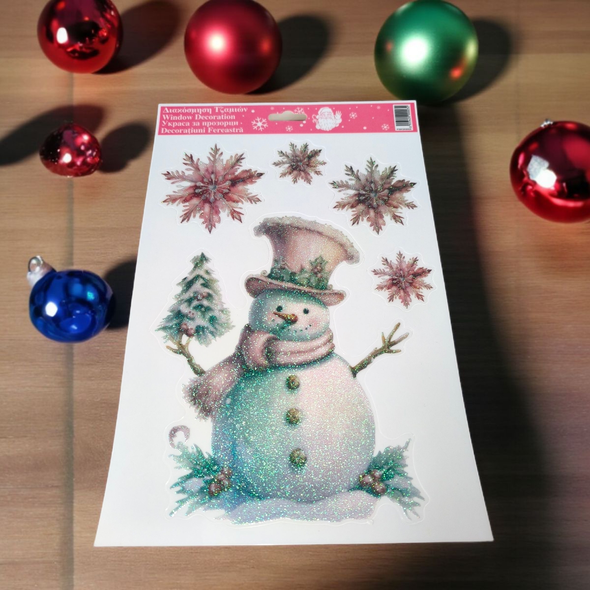 A hóember és a hópelyhek kedves mintája varázslatos karácsonyi hangulatot teremt az ablakokon, tükrökön vagy akár bútorokon.