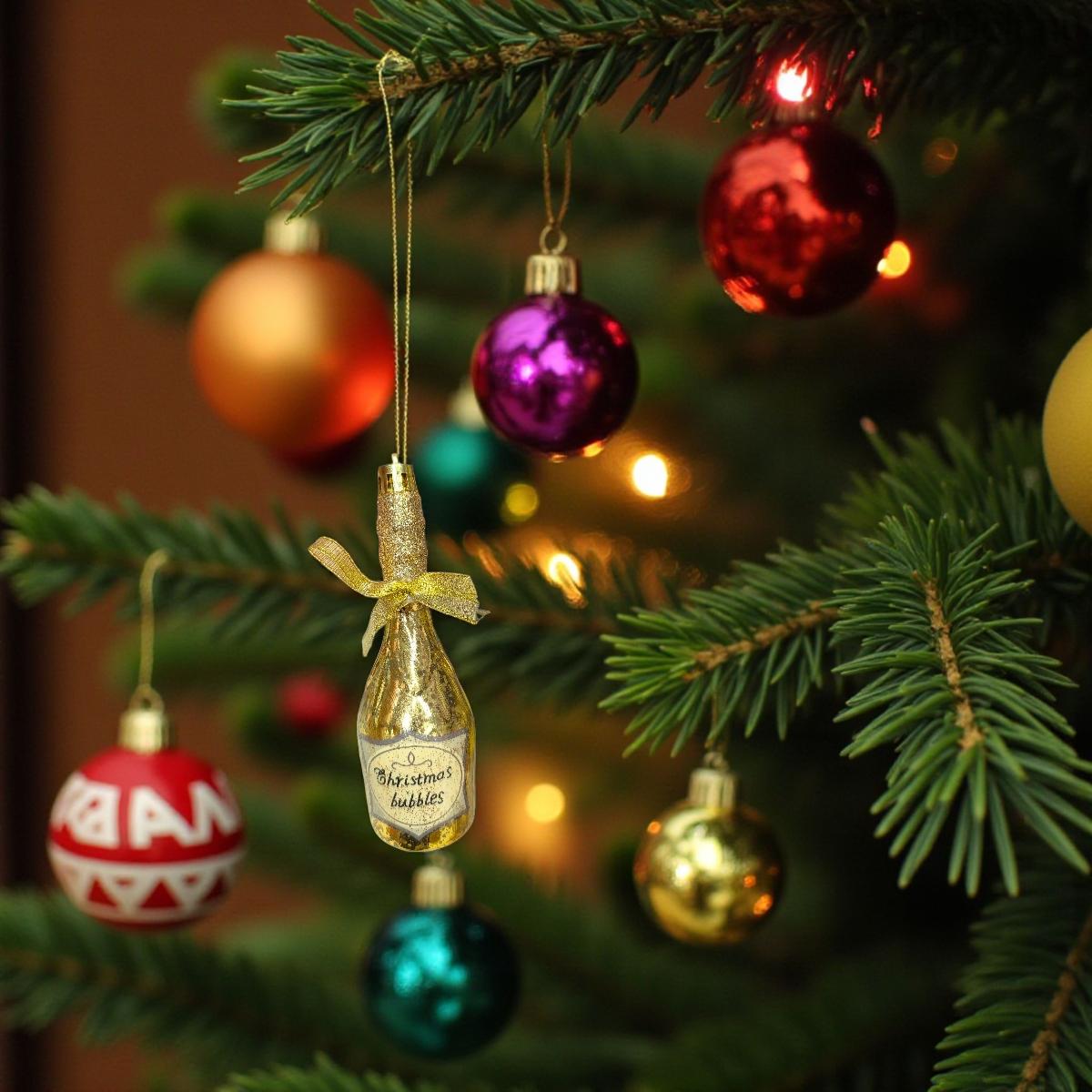 Karácsonyi dekoratív gömb a fa számára, üveg formában, bézs-arany színben, arany masnival és csillogó díszítéssel. A "Karácsonyi buborékok" nyomat eleganciát és ünnepi fényt ad a karácsonyfádnak.