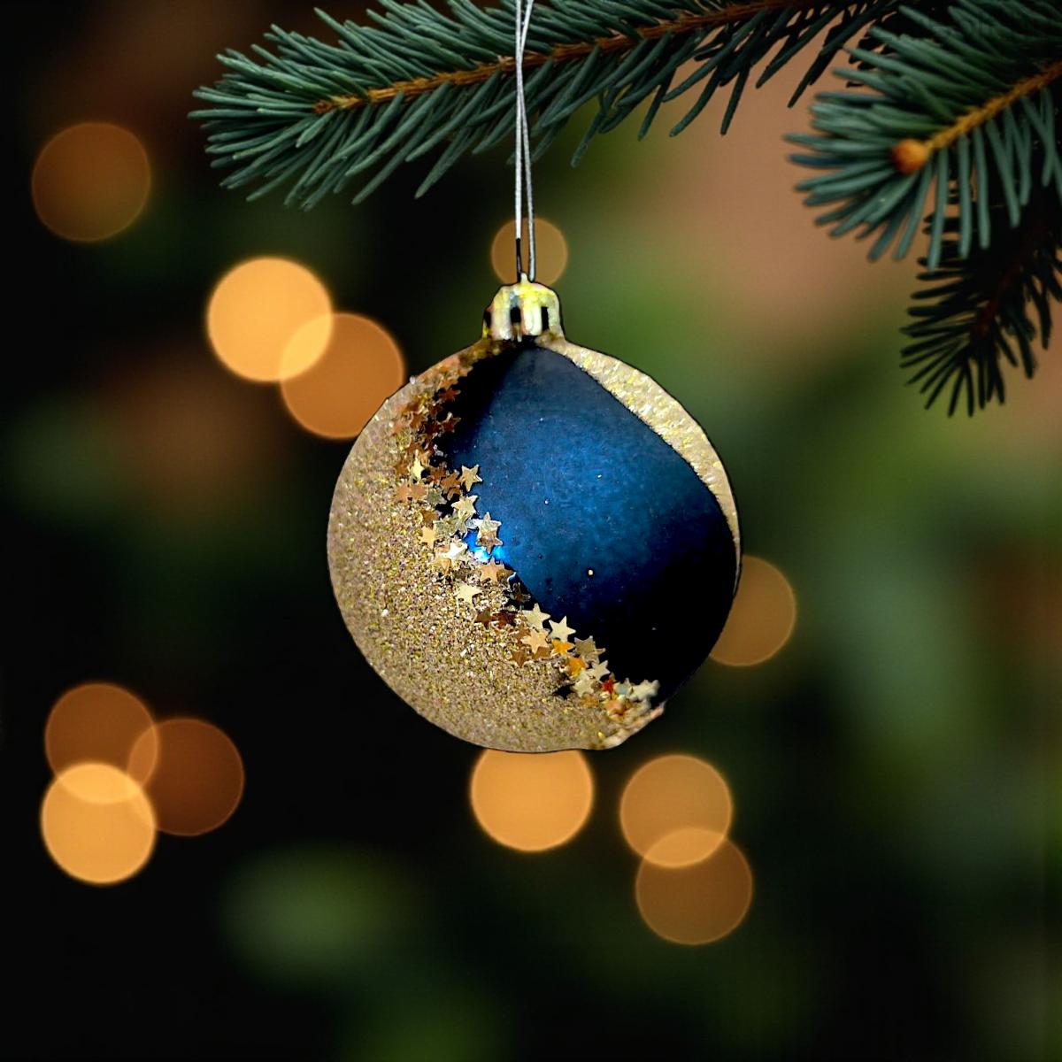 Elegáns aranykék karácsonyfadísz gömb, csillogó arany mintával és konfetti csillagokkal díszítve. Ragyogó, fényvisszaverő felülete feldobja a karácsonyfát, és ünnepi hangulatot varázsol az otthonodba.