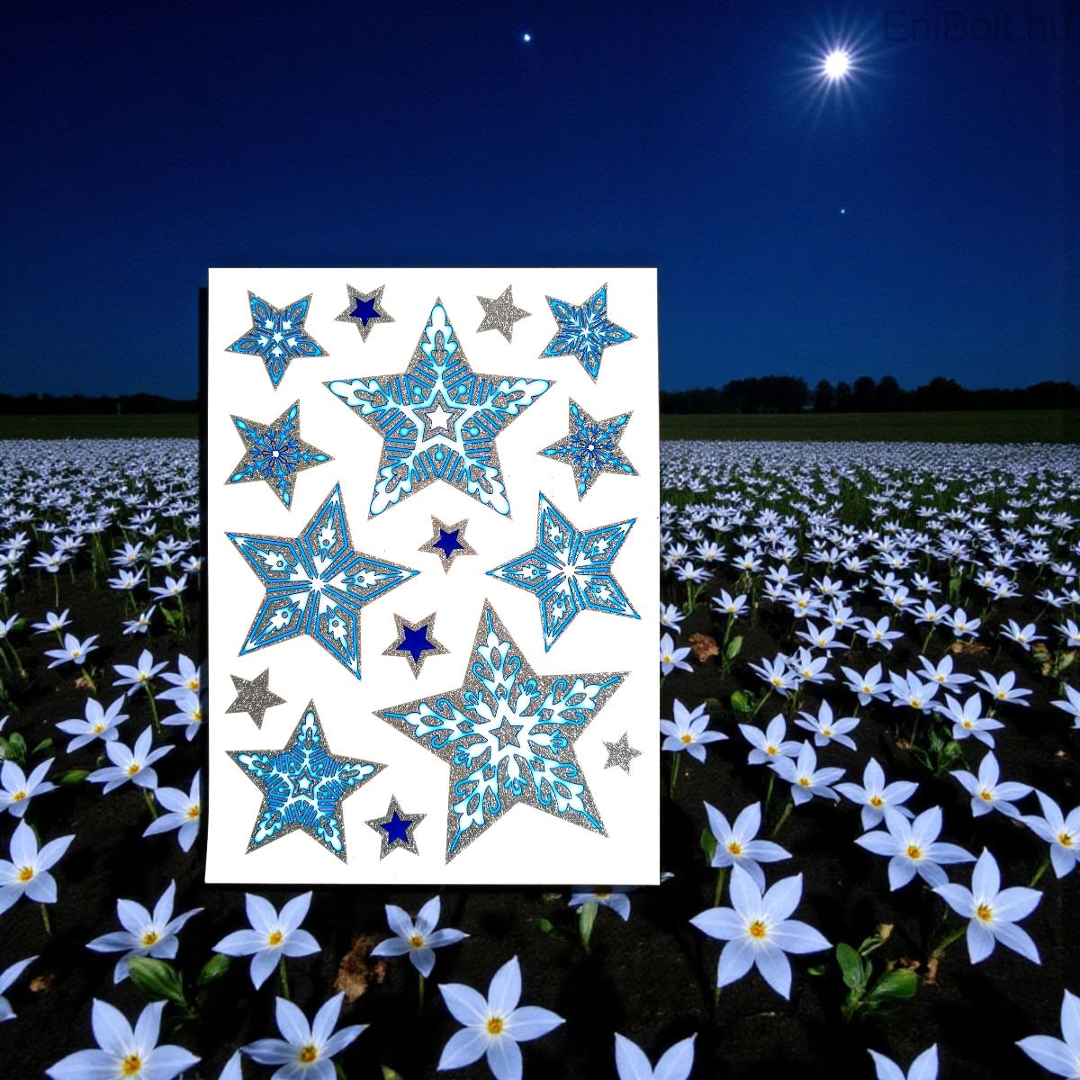 Dobd fel otthonodat ezzel a kék és ezüst csillogó karácsonyi matricával! A csillagmintás dekoráció egyszerűen felhelyezhető üvegre, tükörre vagy bármely sima felületre, és azonnal varázslatos, ünnepi hangulatot teremt.