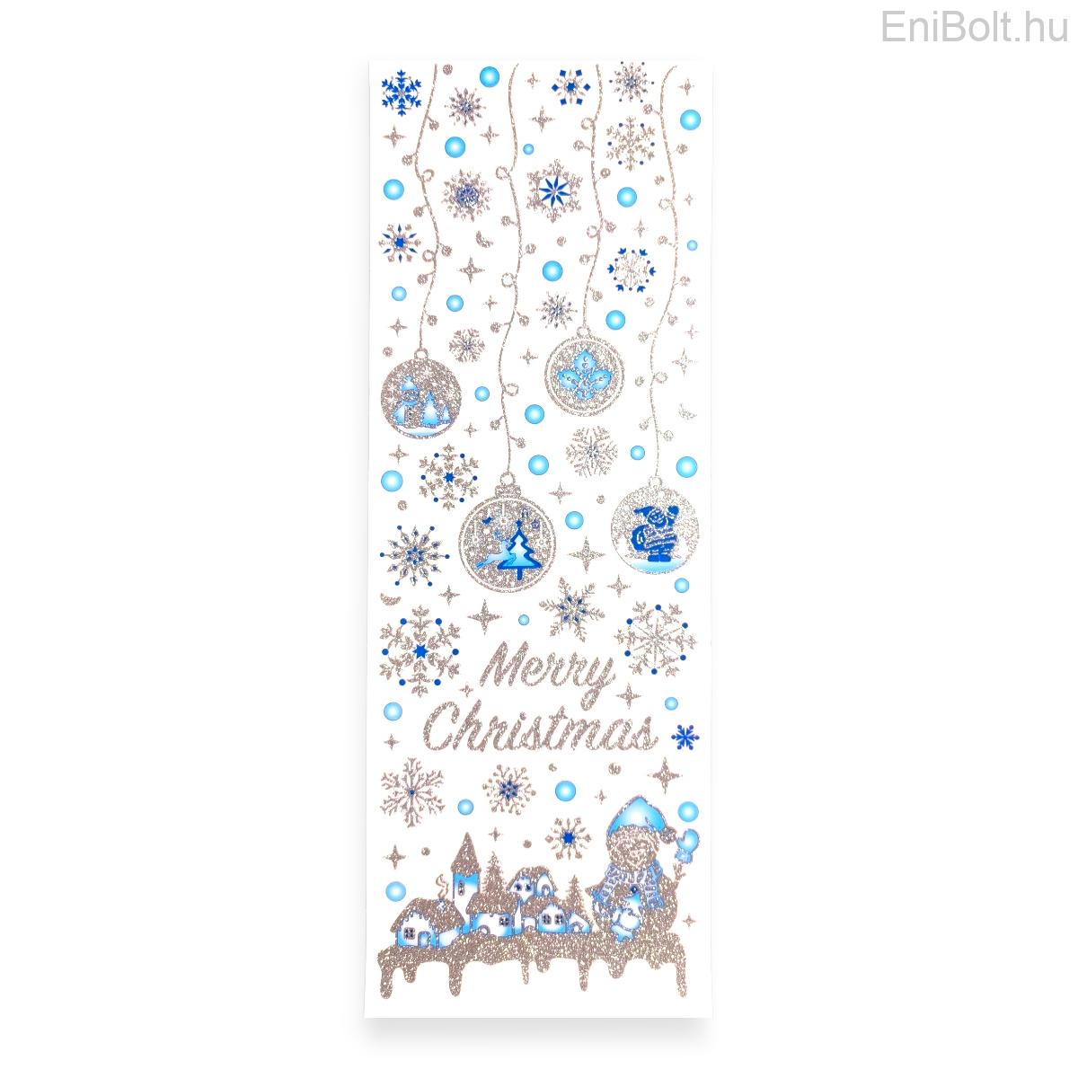 Kék-ezüst csillámos hóemberes karácsonyi ablakmatrica – 20×56 cm