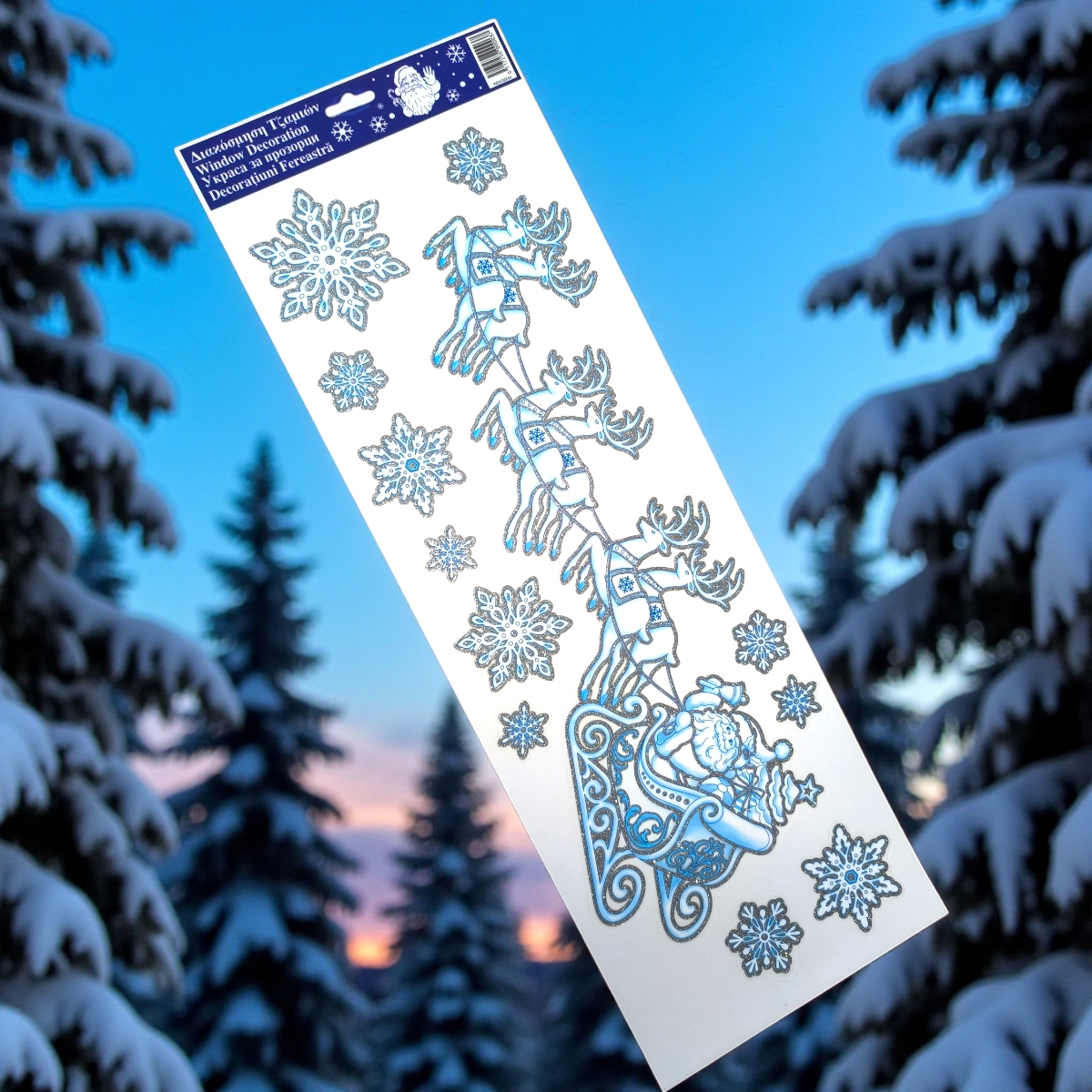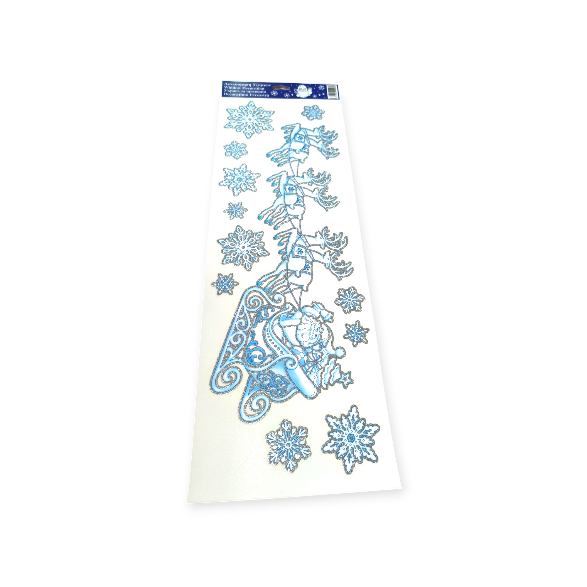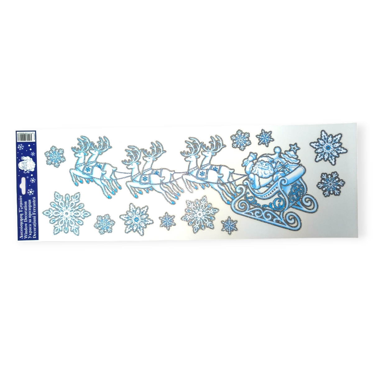 Kezdőlap » Karácsonyi dekorációk » Karácsonyi matricák » Kék karácsonyi ablakmatrica ezüst Mikulás szánnal és hópelyhekkel 20x60 cm
