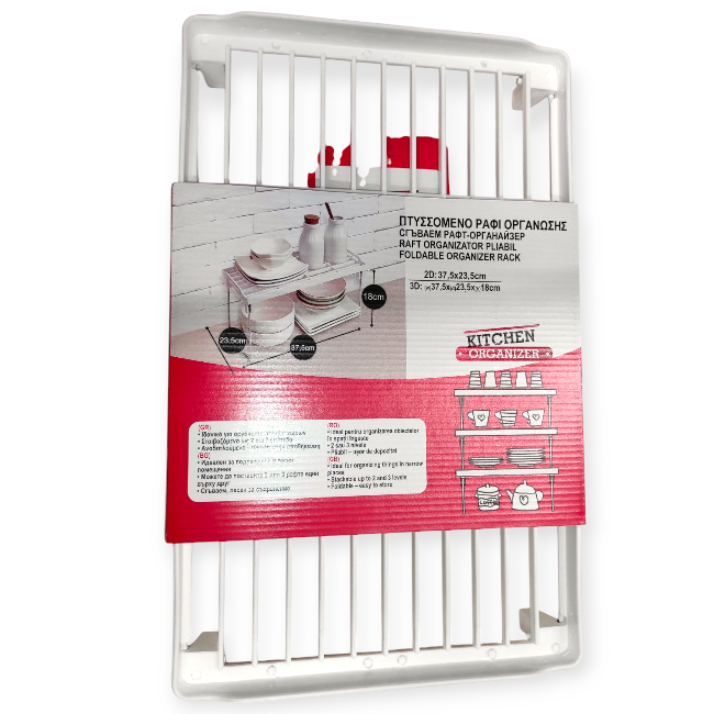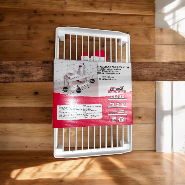 Fehér összecsukható műanyag polc fém lábakkal, amely tökéletes megoldás kis terek praktikus rendszerezéséhez – különösen a konyhában. A polc 2 vagy akár 3 szinten is egymásra rakható, így bővíthető a tárolókapacitás. Összecsukható kialakításának köszönhetően könnyen elhelyezhető és mozgatható, használaton kívül pedig helytakarékosan tárolható. Strapabíró és stabil szerkezetű, mégis könnyű.