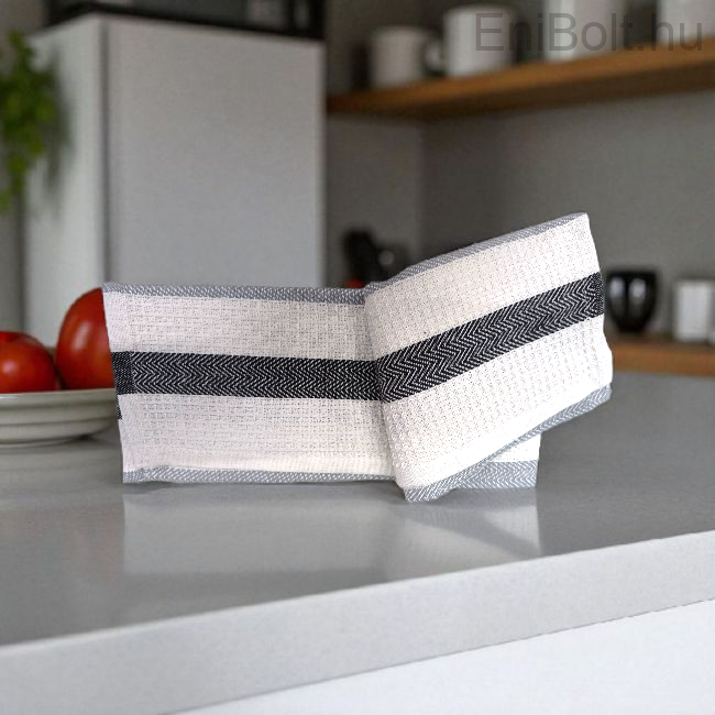 Letisztult stílusú konyharuha, fehér alapon szürke és fekete csíkos mintával. Praktikus és elegáns választás a mindennapi konyhai munkákhoz, edények és poharak szárításához.