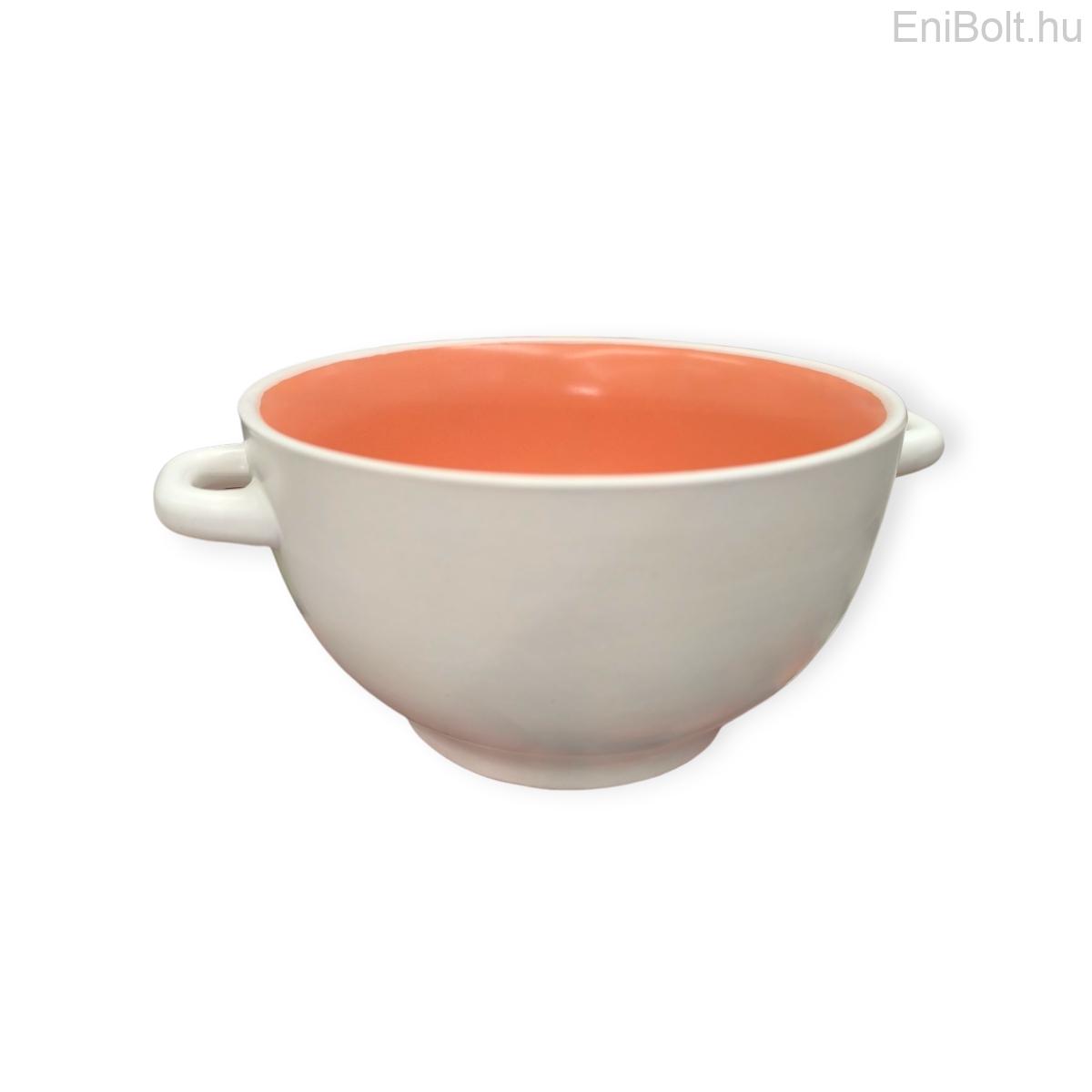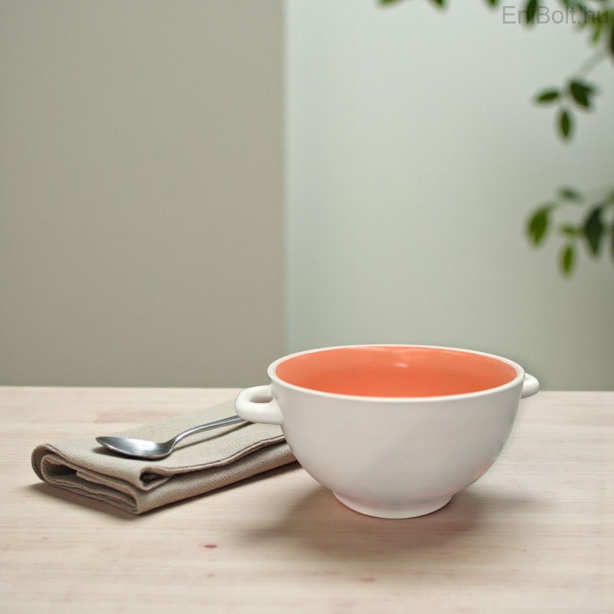 Kezdőlap » Otthon » Konyhai eszközök, kiegészítők » Poharak, tányérok, tálak » Korall-fehér kerámia leveses tál fogantyúval – 700 ml