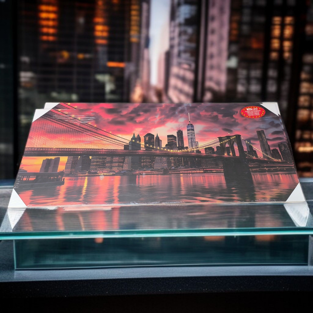 Modern, világító LED-es fali kép, amely a híres New York-i Brooklyn hidat ábrázolja éjszakai fényben. A beépített 14 LED izzó elegáns, városi hangulatot teremt, miközben lágy fényével feldobja a szoba atmoszféráját.