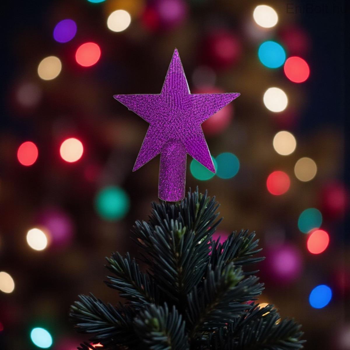 Elegáns, csillámos lila csúcsdísz, amely kiemeli a karácsonyfa megjelenését. Tökéletes választás modern vagy játékos ünnepi dekorációhoz.