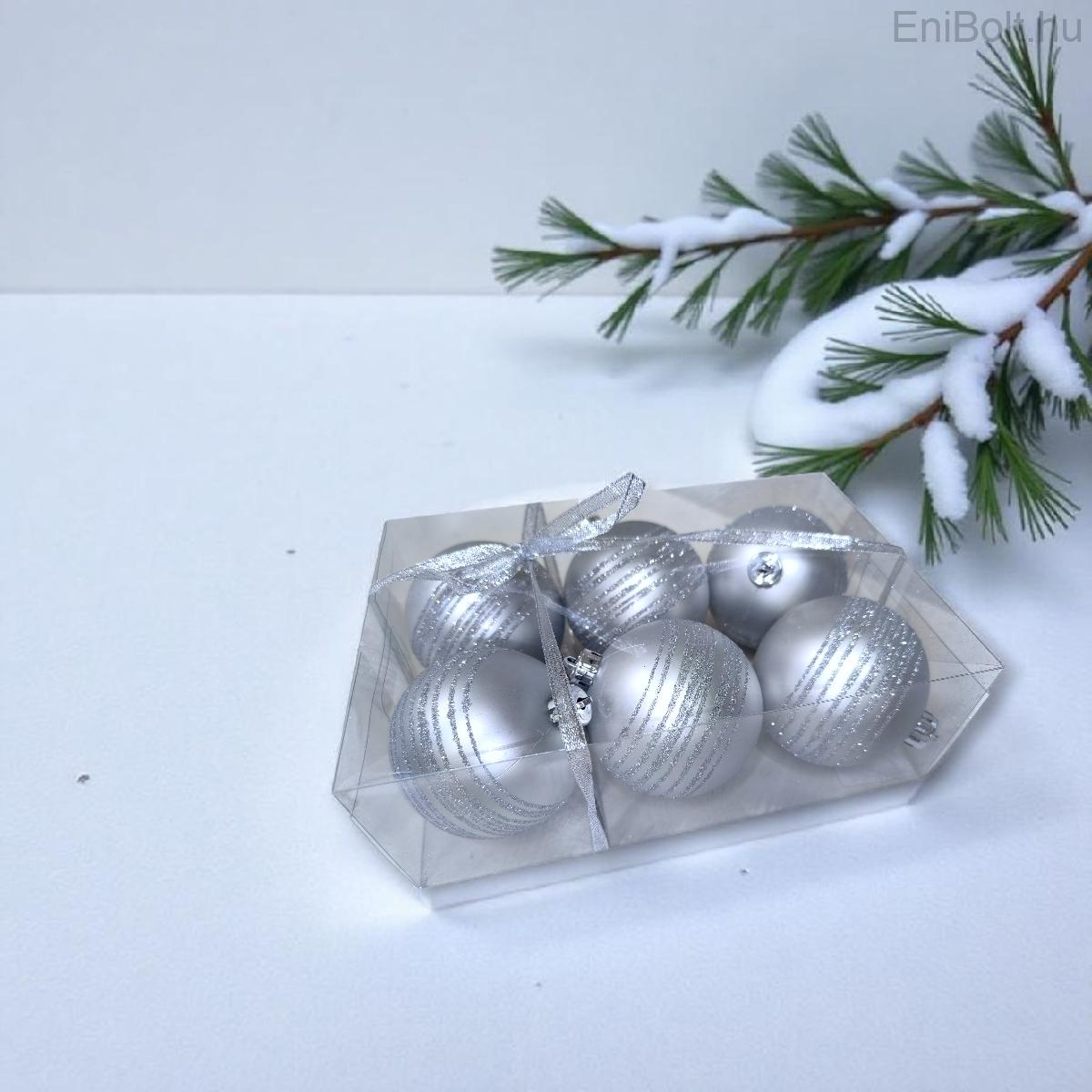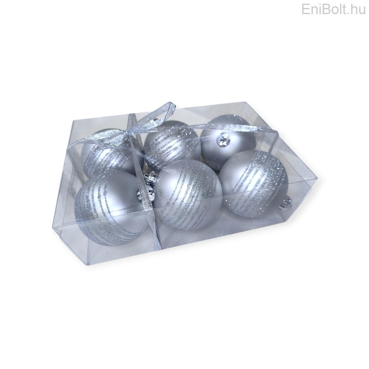 Matt ezüst csíkos csillámos karácsonyfadísz gömb szett – 6 db (8 cm)