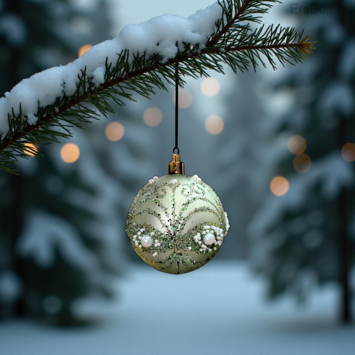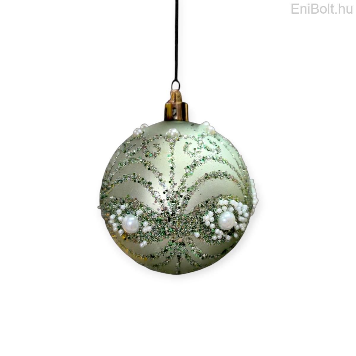 Matt mentazöld karácsonyfadísz gömb csillámmal és gyöngyökkel 10cm