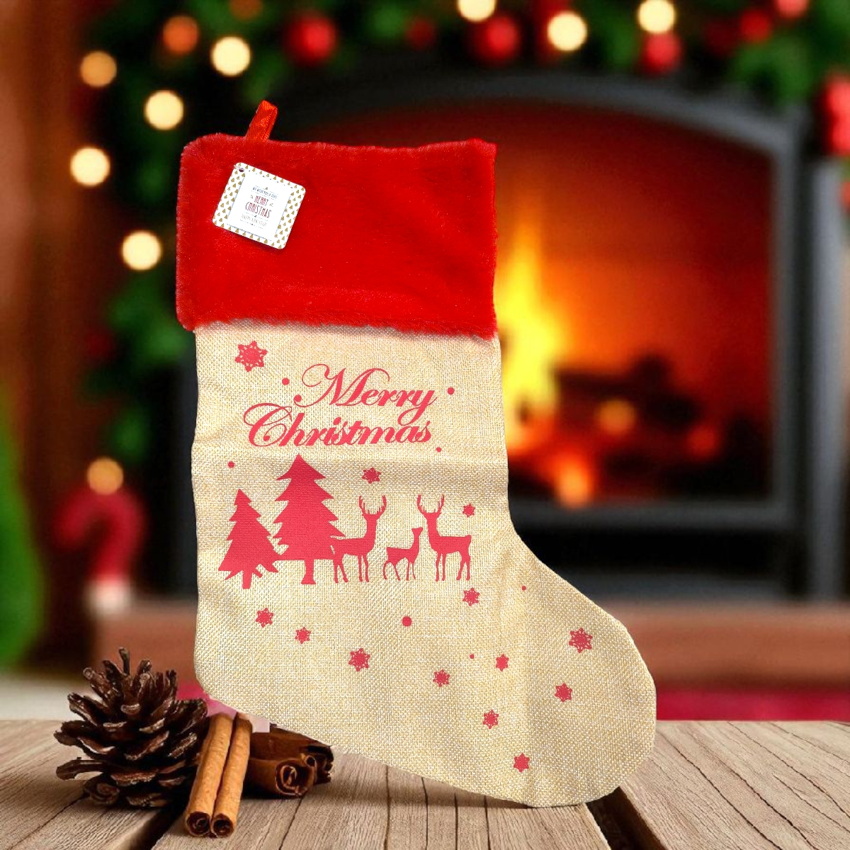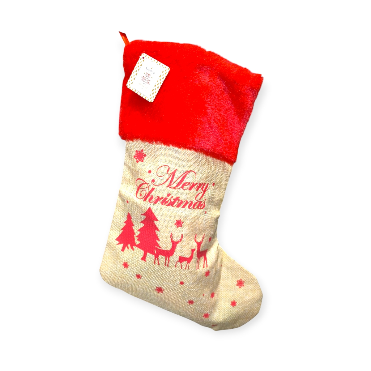 Hangulatos Mikulás csizma bézs zsákvászon hatással, piros szőrmés szegéllyel és rénszarvasos, fenyőfás mintával. A 25x38 cm-es dekoráció ideális apró ajándékok, édességek elhelyezésére, valamint karácsonyi dekorációként is tökéletes.