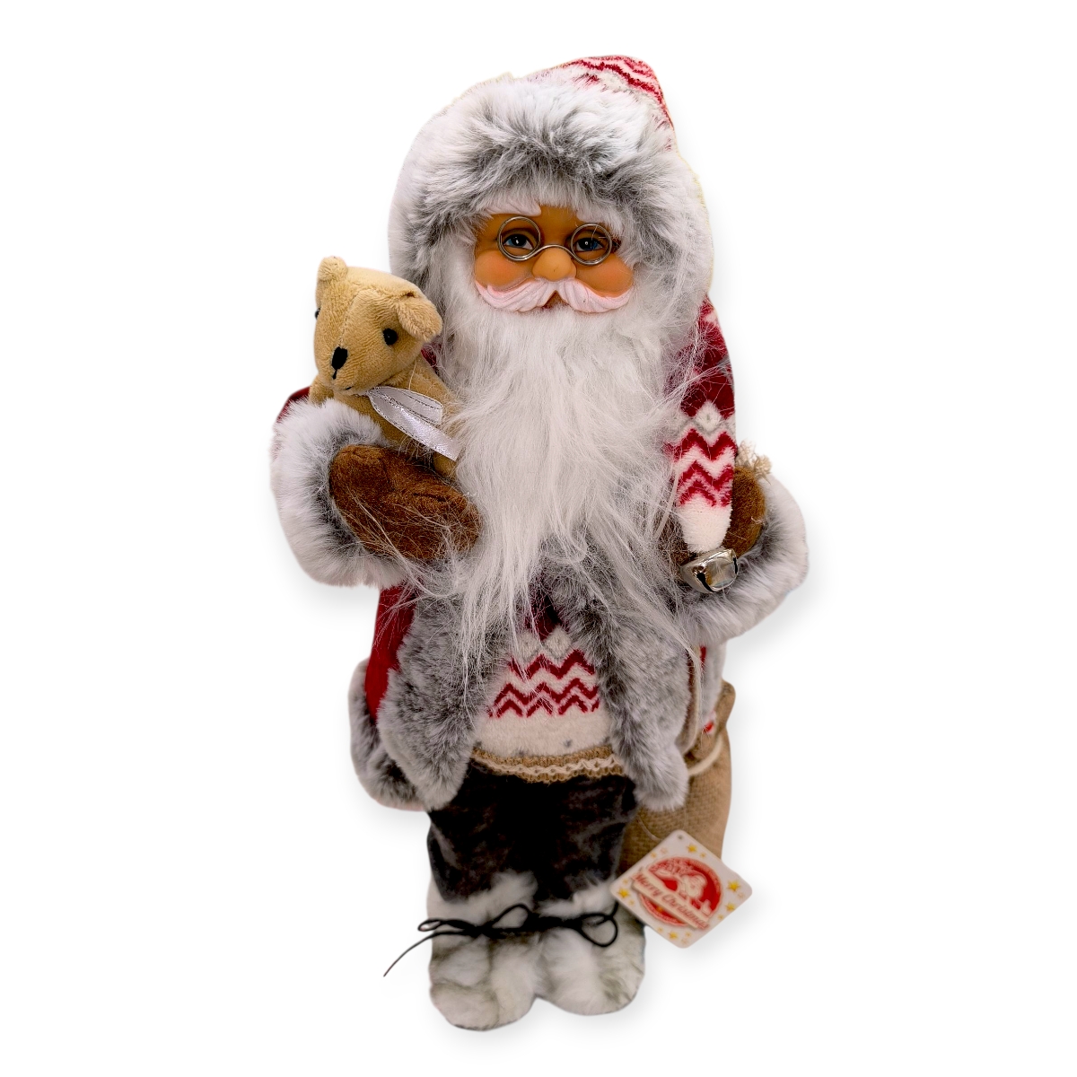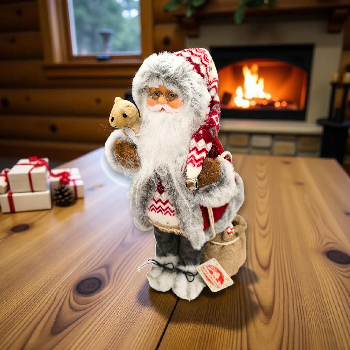 Dekoratív Mikulás figura ajándéktáskával, amely tökéletes kiegészítője az ünnepi dekorációnak. A részletgazdag kidolgozás és a klasszikus karácsonyi öltözék meghitt hangulatot varázsol bármely otthonba.