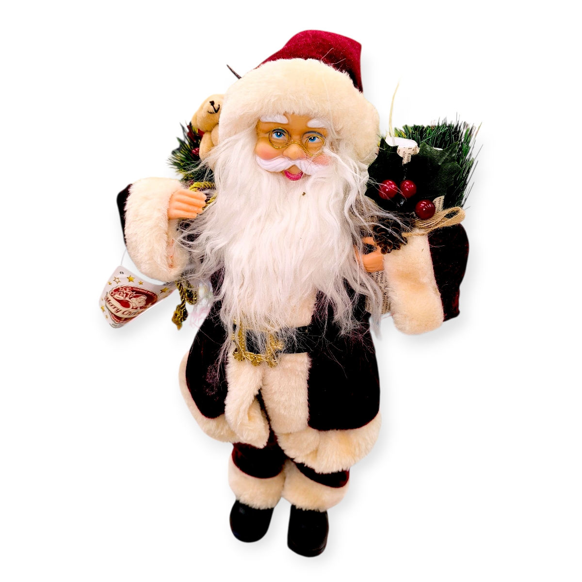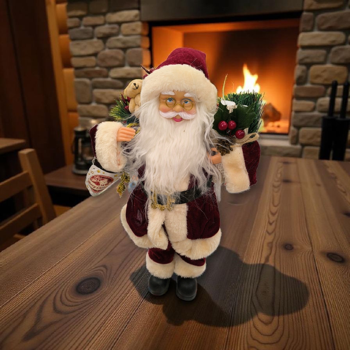 Hozd el otthonodba a karácsony igazi varázsát ezzel a 45 cm magas, bordó jelmezes dekoratív Mikulás figurával! A részletgazdag kidolgozású Mikulás bordó öltönyt visel bézs szegéllyel, fekete csizmát és csengőt a kalapján, valamint piros táskát ajándékokkal és gallyakkal.