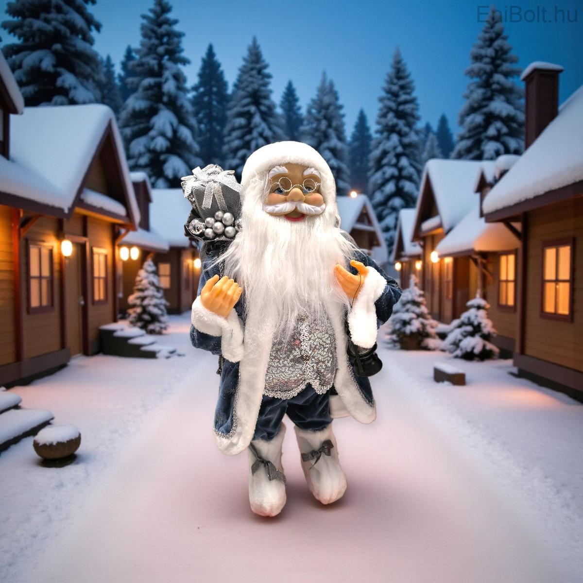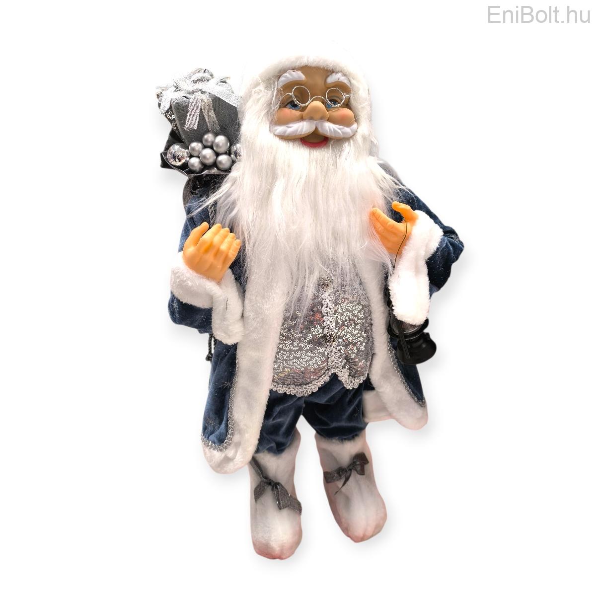 Dekoratív Mikulás figura elegáns kék ruhában, ezüst flitteres mellénnyel, vállán zsákkal és kezében lámpával.