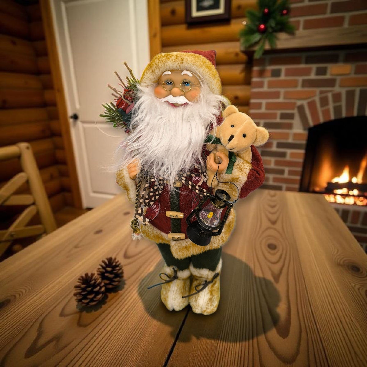 Dekoratív Mikulás figura lámpással és macival, amely meghitt karácsonyi hangulatot teremt otthonában. A részletgazdag kidolgozás és az ünnepi öltözék különleges varázst visz a lakás minden szegletébe.