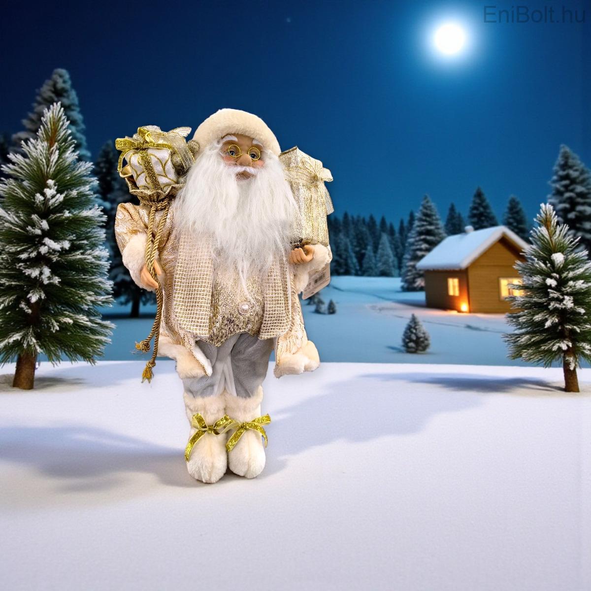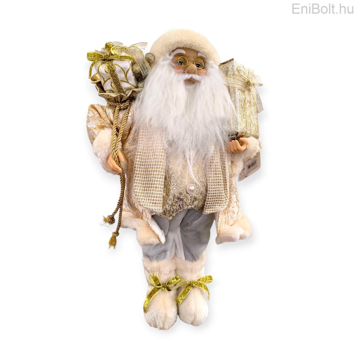Kezdőlap » Karácsonyi dekorációk » Mikulás figurák » Mikulás figura pezsgő bézs kabátban ajándékkal és zsákkal 45cm
