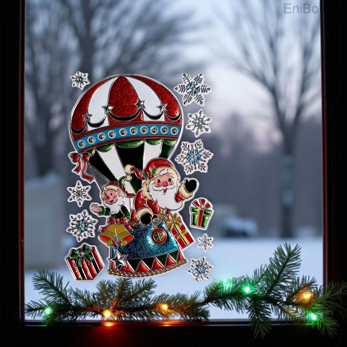 Lepd meg családodat és vendégeidet ezzel az egyedi karácsonyi matricával, amely Mikulást ábrázolja színes ajándékokkal teli légballonban! Vidám, játékos és ünnepi hangulatot teremt, amely feldobja az ablakokat, falakat vagy tükröket.