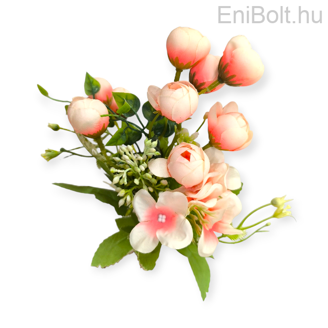 A 30 cm-es művirágcsokor rózsaszín-barack árnyalatával lágy és természetes hatást kelt bármely helyiségben.