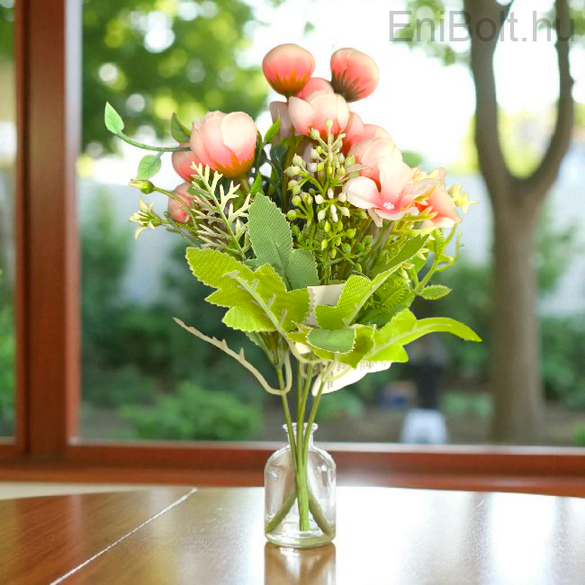 Ez a rózsaszín-barack árnyalatú művirágcsokor friss, mégis finoman elegáns hangulatot teremt otthonodban. Kiváló választás azoknak, akik tartós, gondozásmentes, mégis természetes hatású dekorációt keresnek.