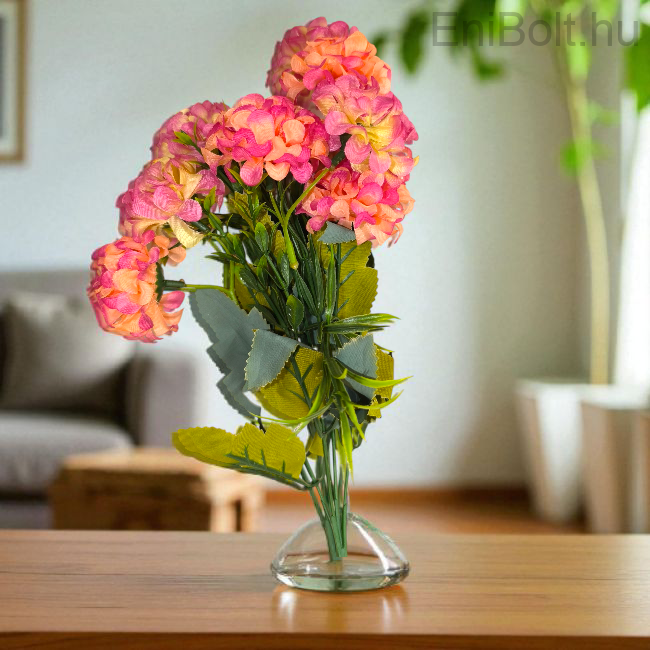 A 37 cm-es rózsaszín hortenzia művirágcsokor ideális választás, ha virágos hangulatot szeretnél otthonodba vinni egyszerűen és tartósan.
