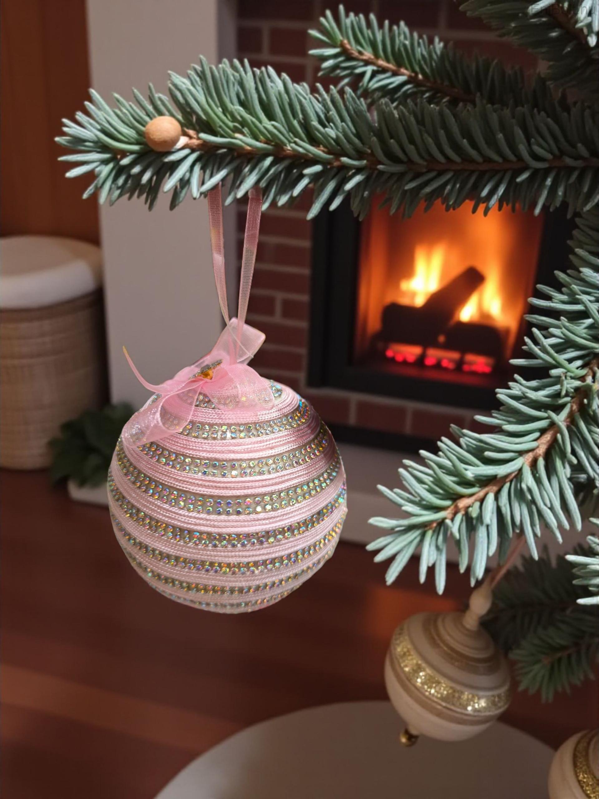 Elegáns pasztell rózsaszín karácsonyfadísz, melyet finom csipkecsíkok, holografikus strasszok és arany virágdísz ékesít. A dísz tetején elhelyezett strasszok és rózsaszín masni különleges, romantikus megjelenést biztosít, amely kifinomult fényt ad minden karácsonyfának.