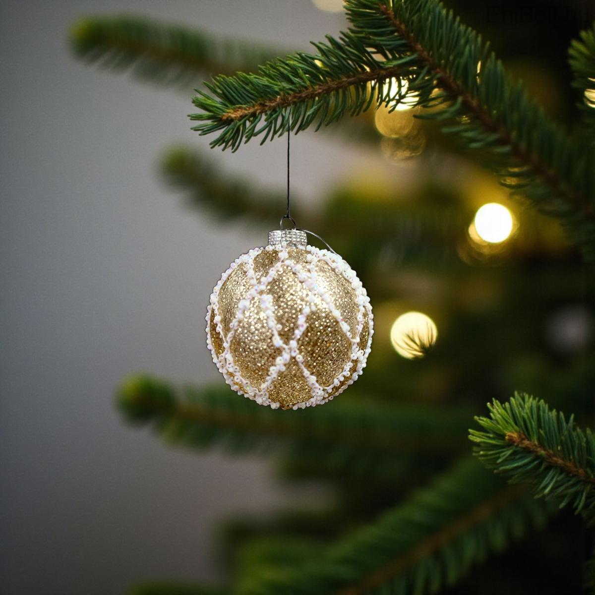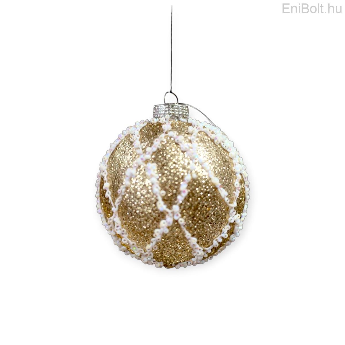 Dekoratív karácsonyfadísz pezsgő bézs színben, csillogó felülettel és fehér holografikus gyöngyökkel díszítve. A hálós mintázat elegáns, ünnepi megjelenést kölcsönöz a fának.