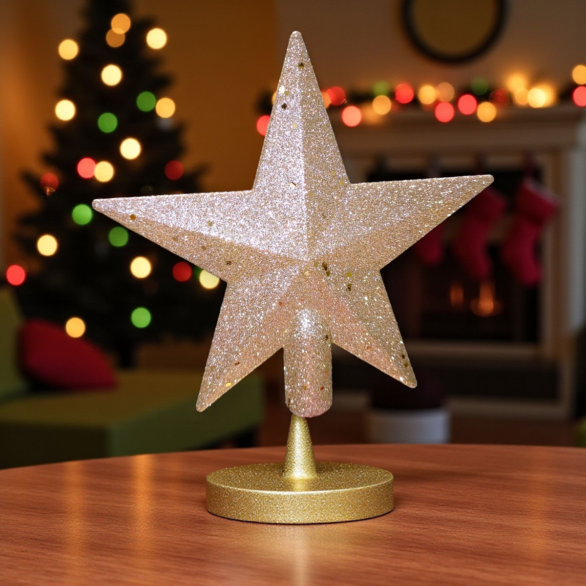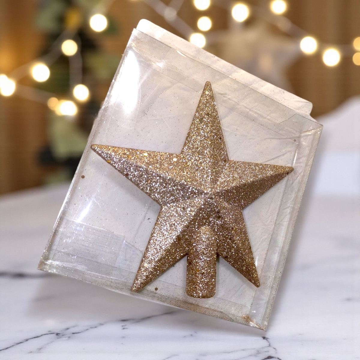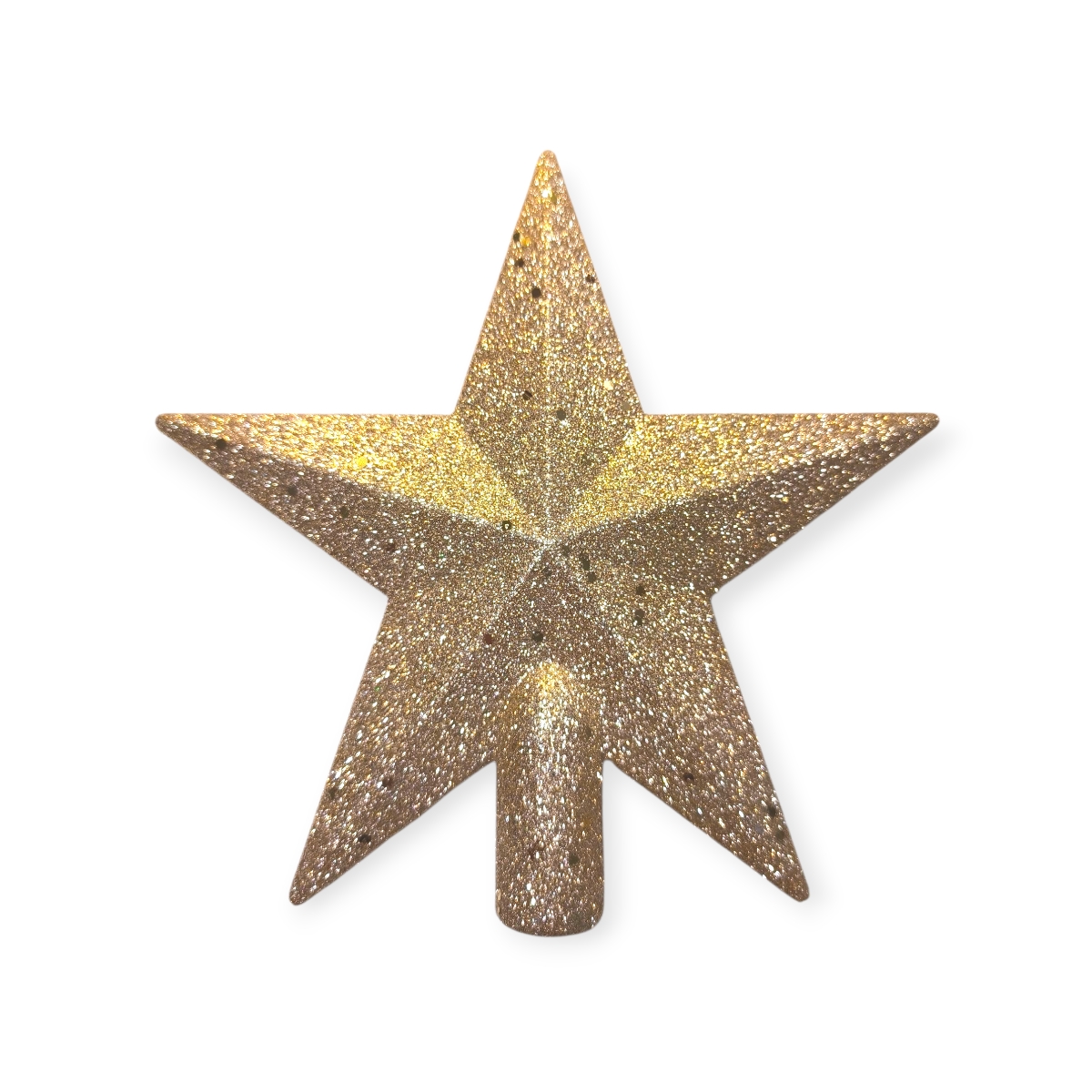 Elegáns pezsgő színű csillag alakú csúcsdísz, melyet csillogó flitterek díszítenek. A 19 cm-es műanyag dísz fényesen ragyog a fa tetején, és tökéletesen illeszkedik más pezsgő, arany vagy fehér karácsonyi dekorációhoz.