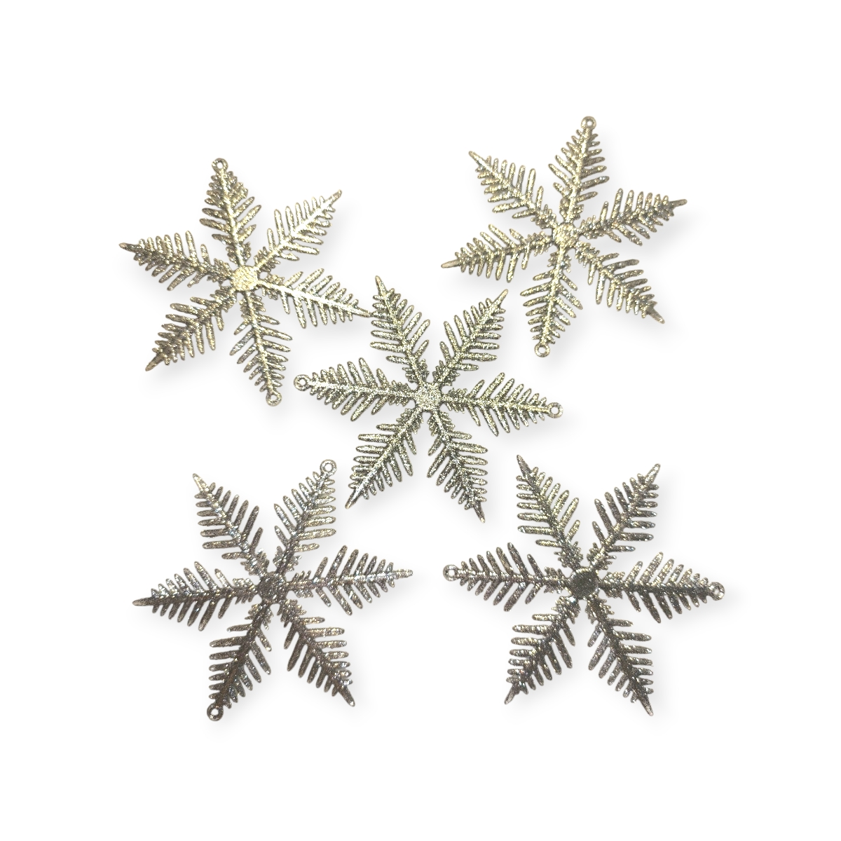 Elegáns, pezsgő színű hópihe karácsonyi díszek 5 darabos kiszerelésben. A csillogó felületű, 8 cm-es hópelyhek különleges fényt és ünnepi hangulatot varázsolnak a karácsonyfára vagy más dekorációra.