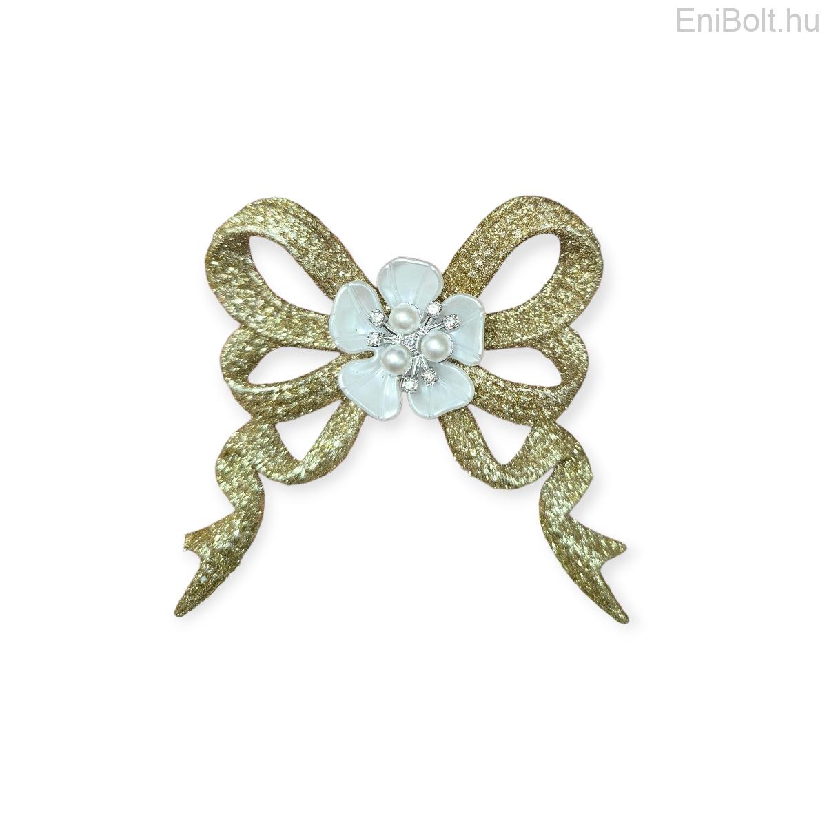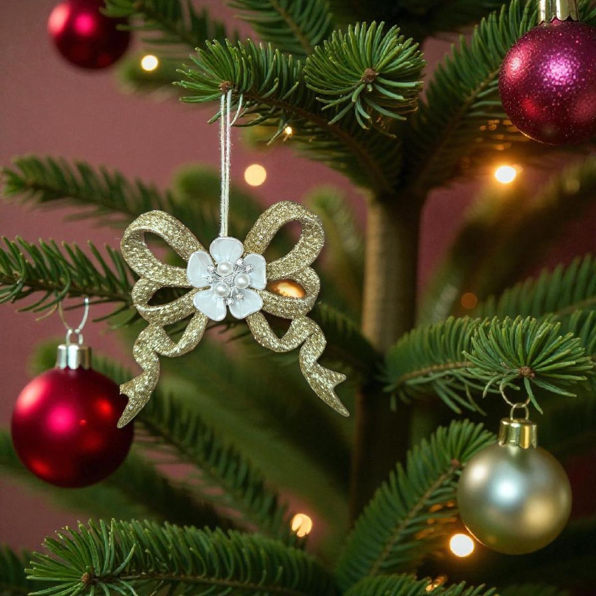 Elegáns pezsgő masni karácsonyfadísz csillámmal és fehér gyöngyös virággal, amely ünnepi fényt és stílust kölcsönöz a karácsonyfának.