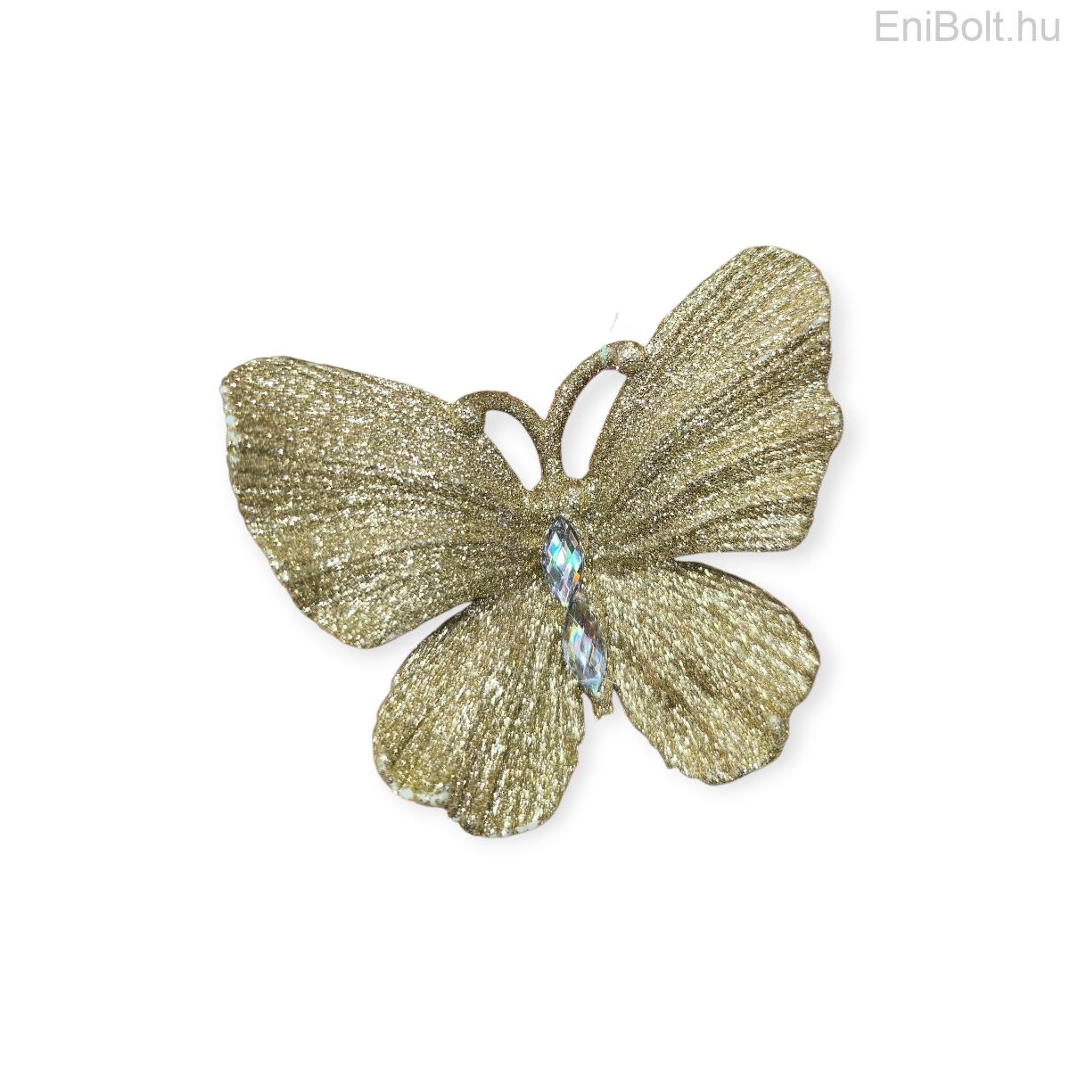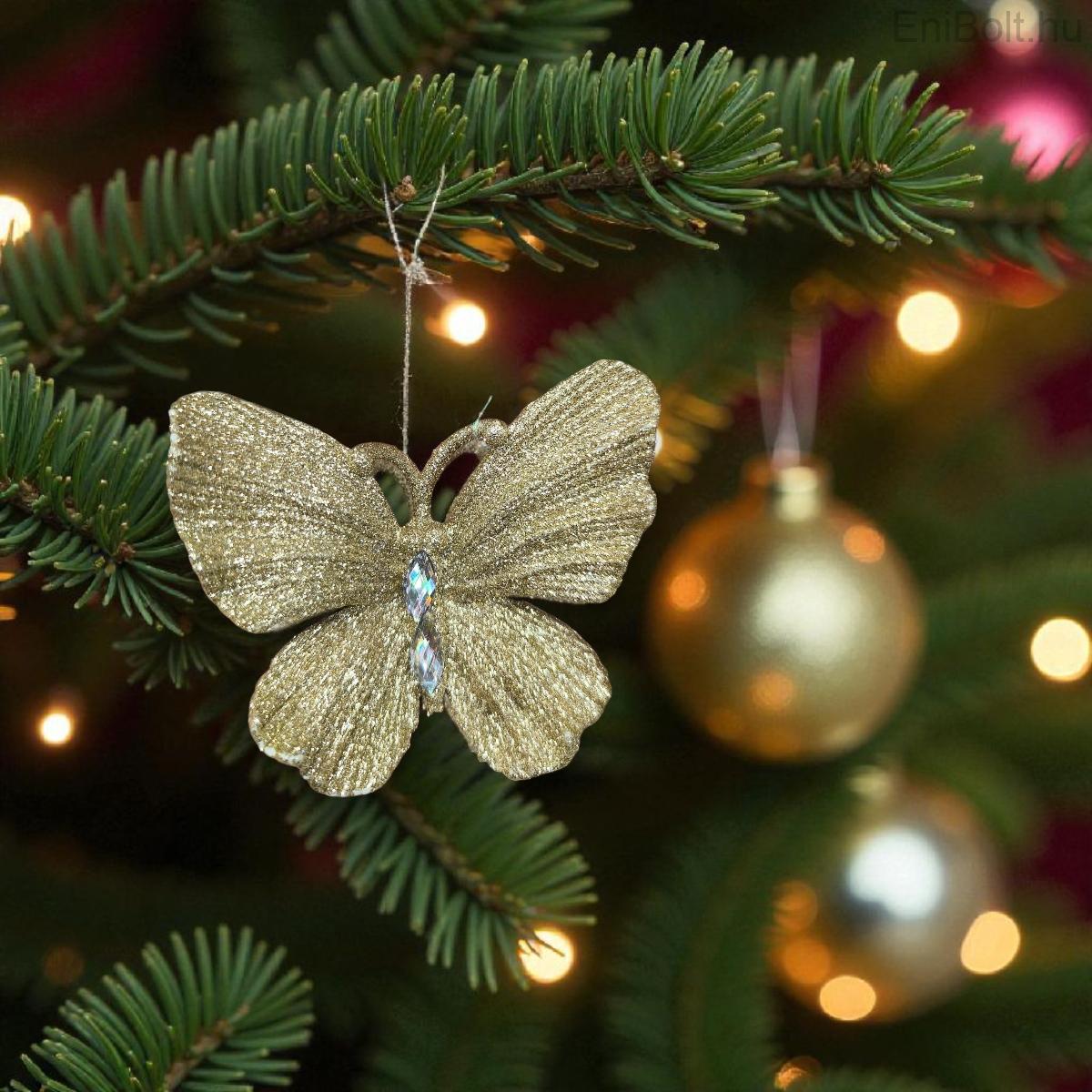 Elegáns pezsgő színű pillangó karácsonyfadísz csillámmal és kristályokkal, amely ünnepi fényt és stílust kölcsönöz a fára.