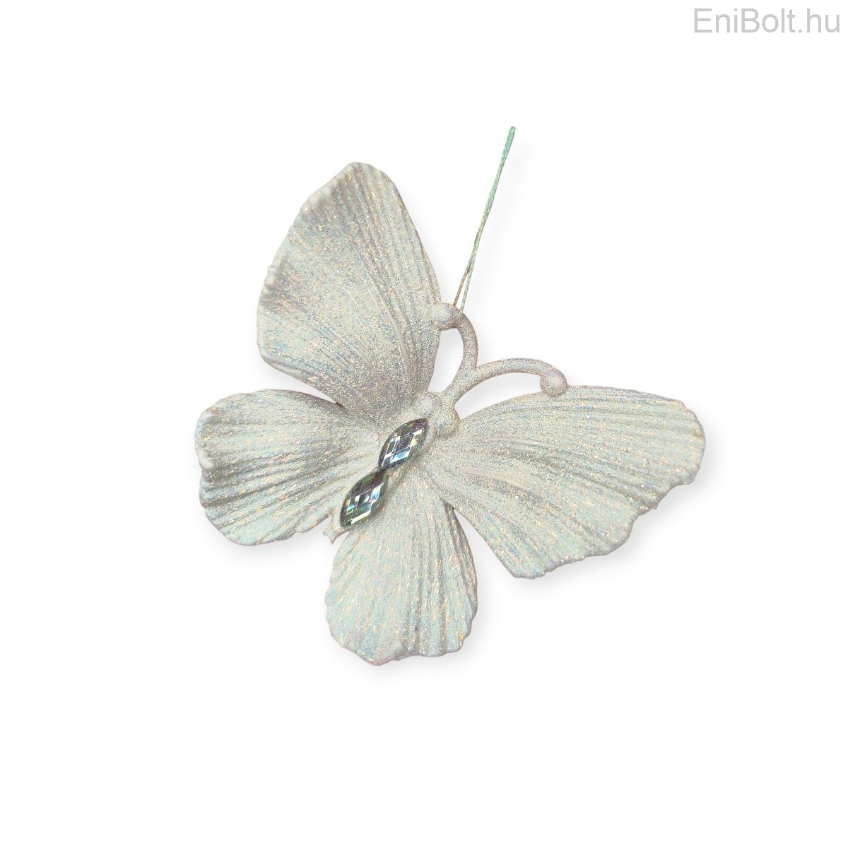 Pillangó karácsonyfadísz irizáló fehér csillámmal és kristályokkal 11x9cm