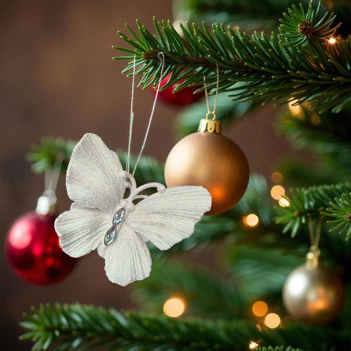 Karácsonyfadísz, fehér pillangó irizáló csillámmal és csillogó kristályokkal, amely eleganciát és különlegességet ad a karácsonyfádnak.