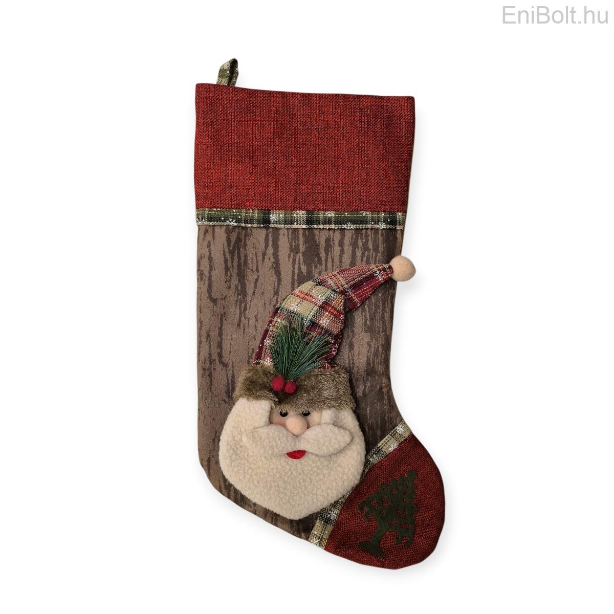 Dekoratív karácsonyi csizma piros színben, 3D-s Mikulással és piros-bézs kockás, prémes sapkával.