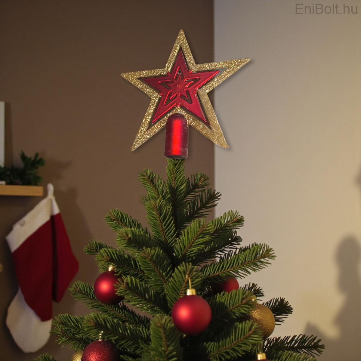 Kezdőlap » Karácsonyi dekorációk » Csúcsdíszek, Kreatív kellékek » Piros-arany csillagos karácsonyfa csúcsdísz csillámmal – 16,5 cm
