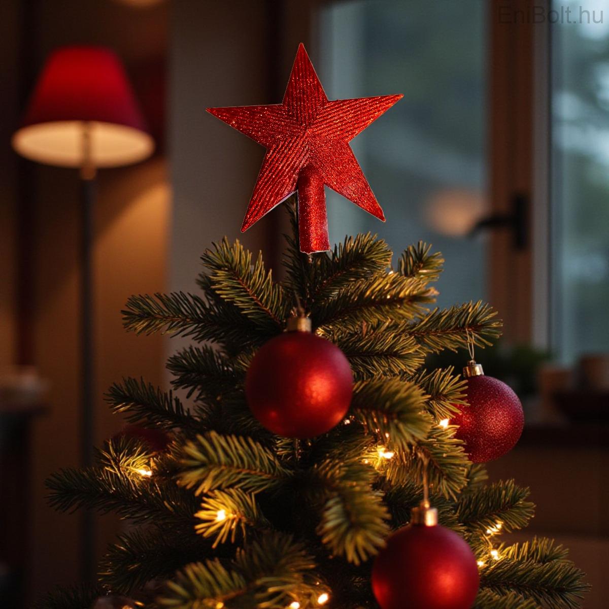 A piros csillámos csúcsdísz a karácsonyfa koronája – egyszerű, látványos és örök ünnepi eleganciát sugároz.