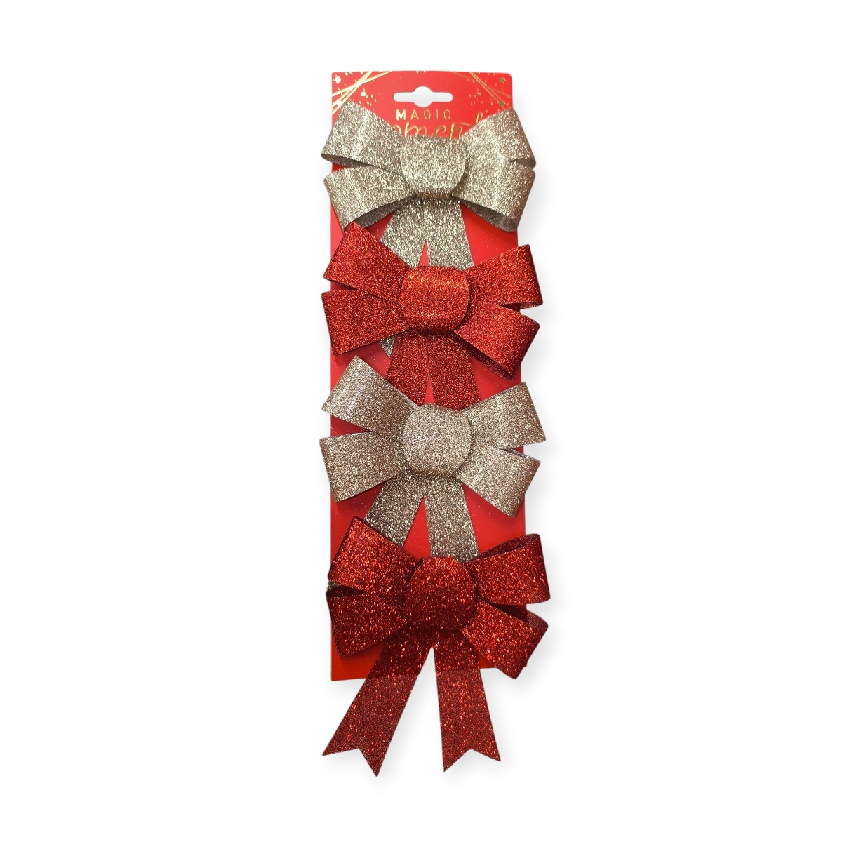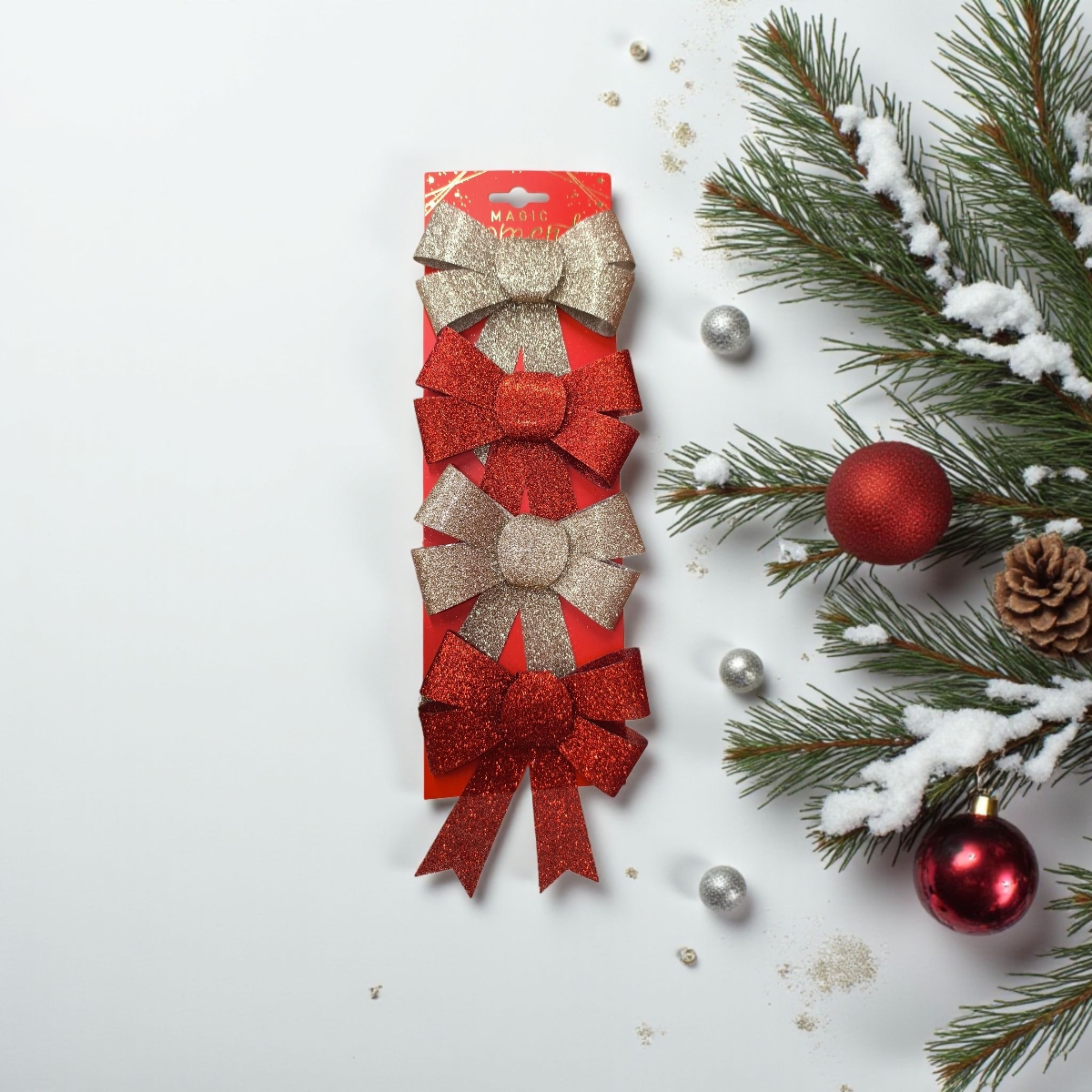 Kezdőlap » Karácsonyi dekorációk » Karácsonyfa gömbök » Piros díszek » Piros és bézs csillámos karácsonyi dekor masni szett 13 cm – 4 db