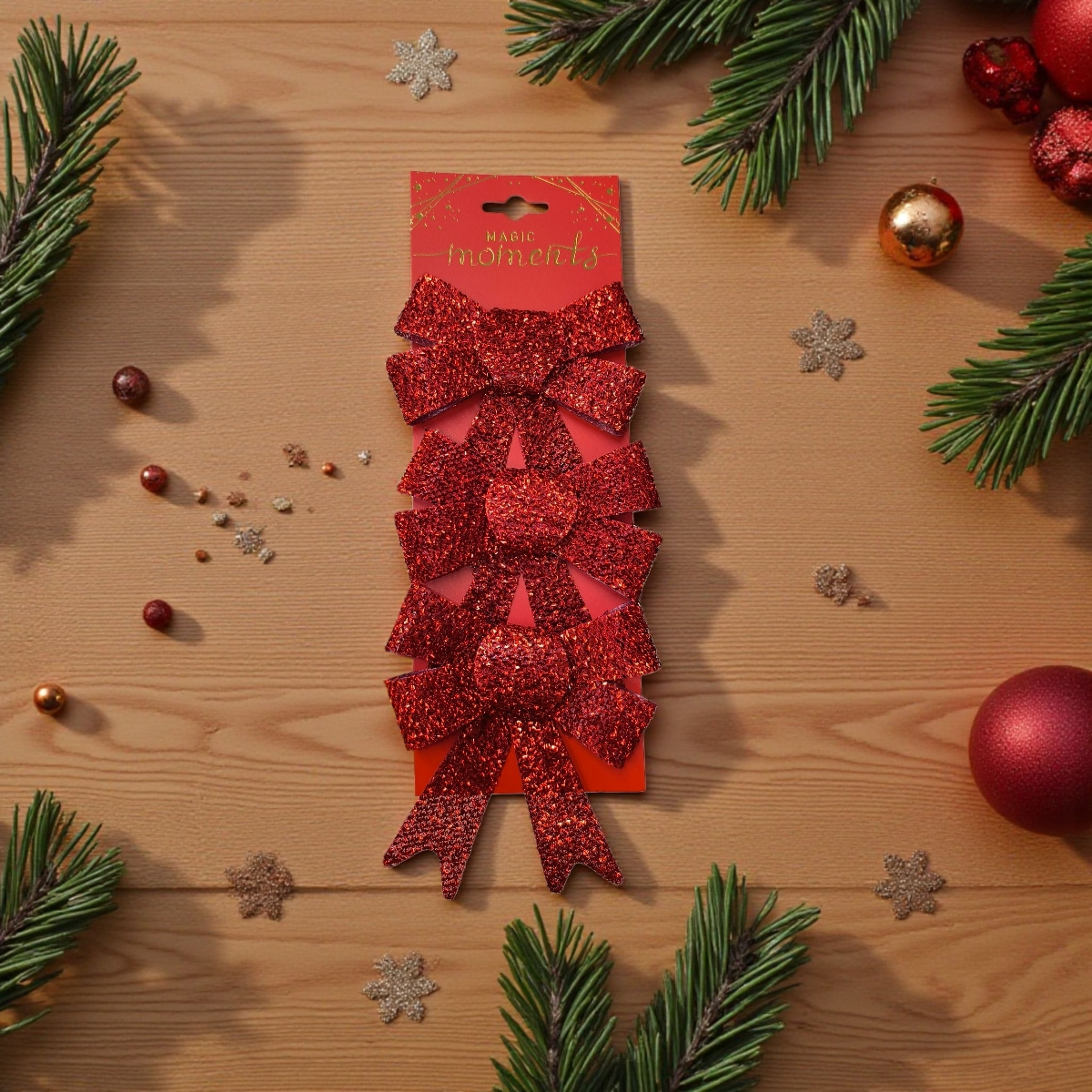 Ragyogó piros karácsonyi dekoratív masnik csillámos felülettel, amelyek feldobják bármely ünnepi díszítést. Használd a karácsonyfa, ajtók, koszorúk, függönyök vagy ajándékok dekorálásához – igazi ünnepi hangulatot varázsolnak otthonodba.