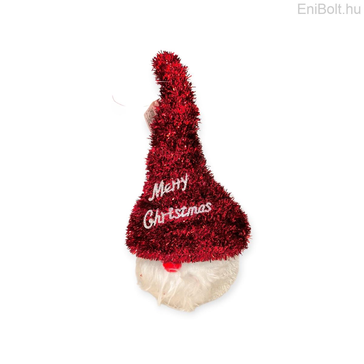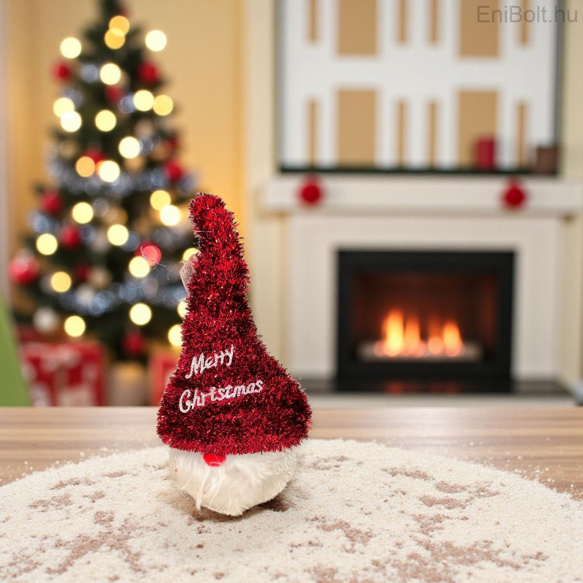 Dekoratív karácsonyi gnóm piros talmi kalappal, fehér szakállal és ezüst „Boldog karácsonyt” felirattal. Vidám, ünnepi hangulatot teremt otthonában, tökéletes választás polcra, asztalra vagy a karácsonyfa mellé.