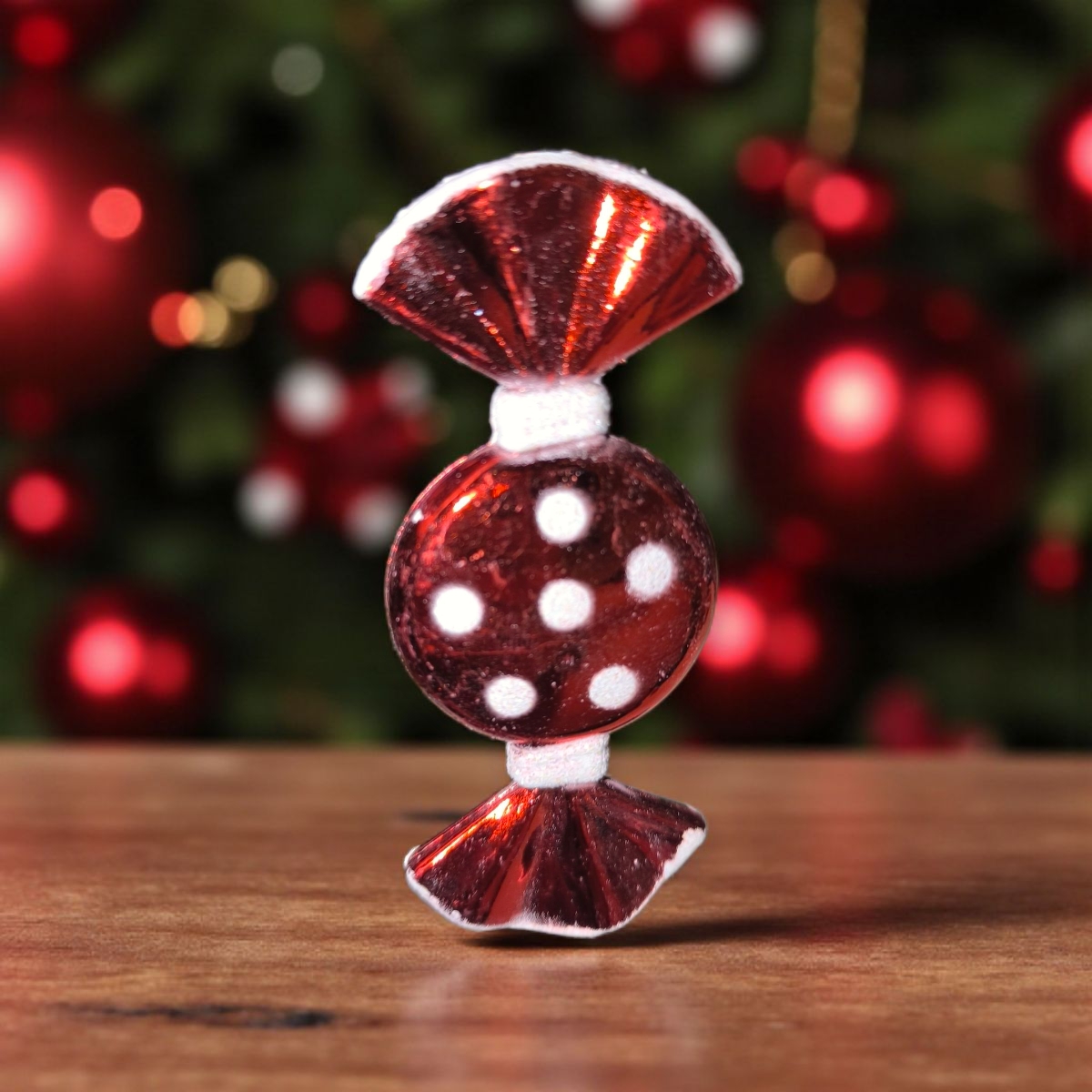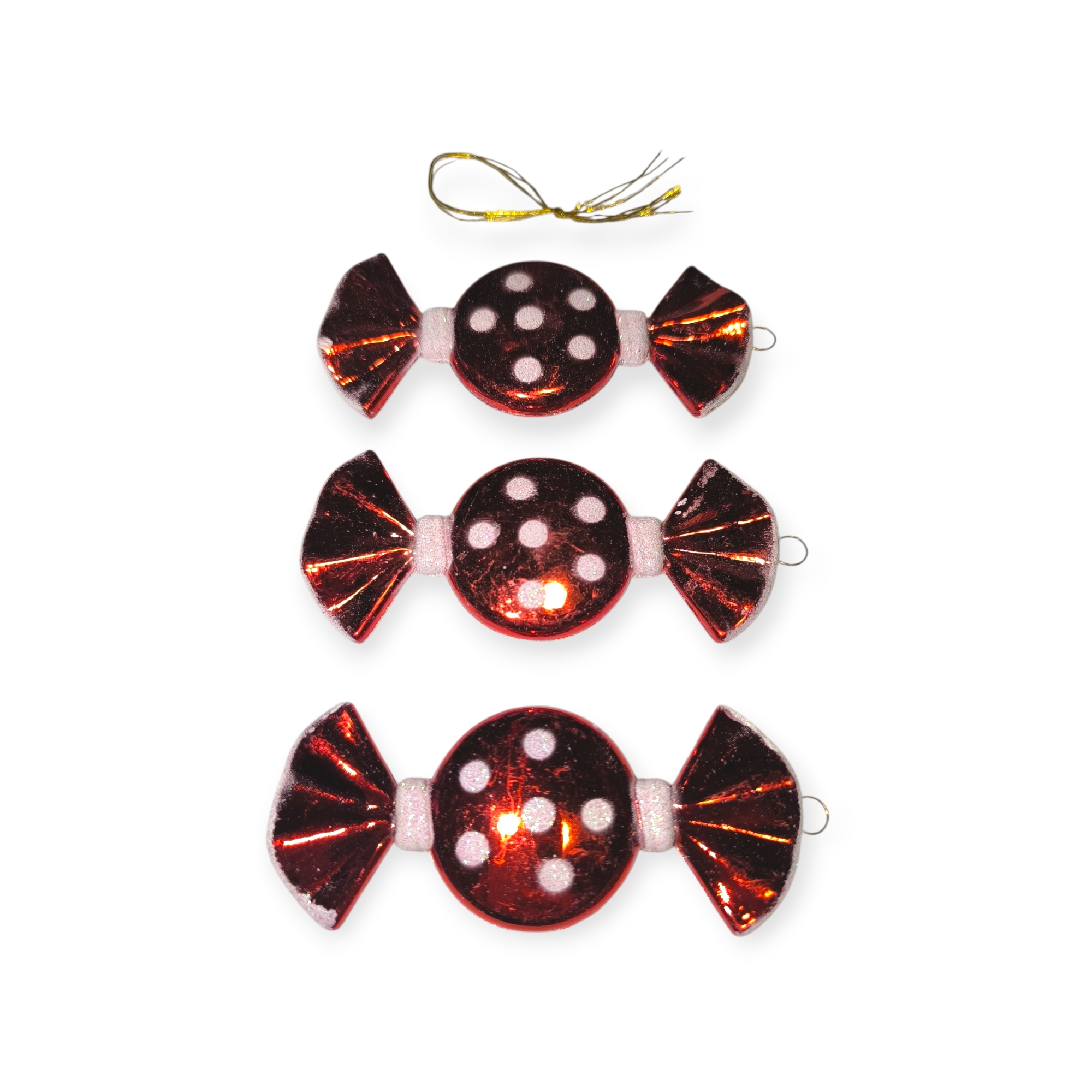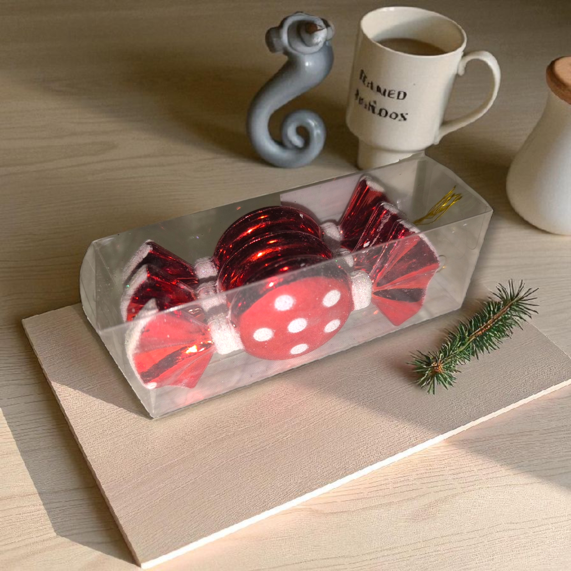 Hagyományos hangulatú piros szaloncukor karácsonyfa díszek, melyek különleges fényükkel ünnepi varázst visznek a fenyőfára. A készletben 3 darab, 9 cm-es műanyag dísz található, amelyek tökéletesen kiegészítik a klasszikus karácsonyi dekorációt.