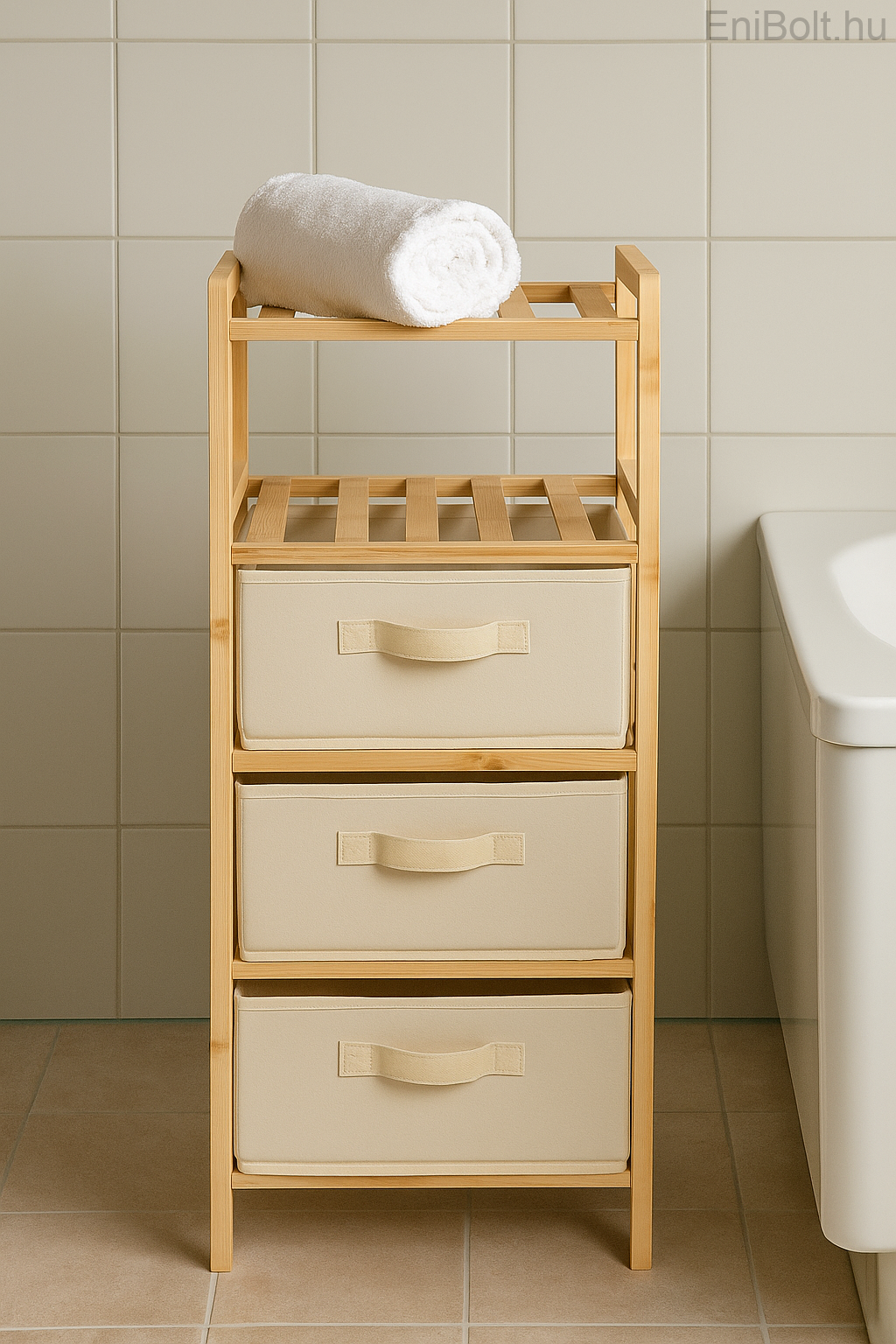 Kezdőlap » Rendszerezés és tisztítás » Fürdőszobai kellékek, tárolók » Fürdőszobai polcok » Polc fiókokkal fürdőszobába 5 szintes, fa váz 2 polc 3 textilfiók 32x26x76 cm