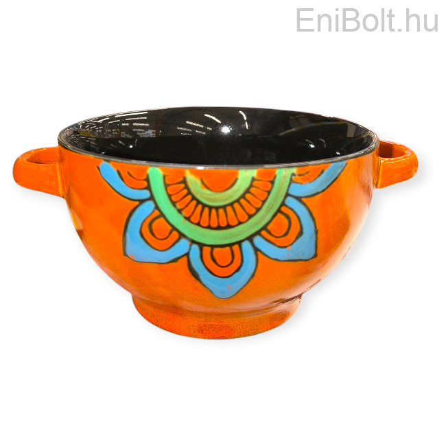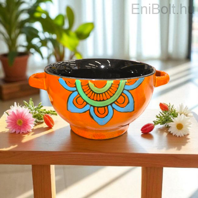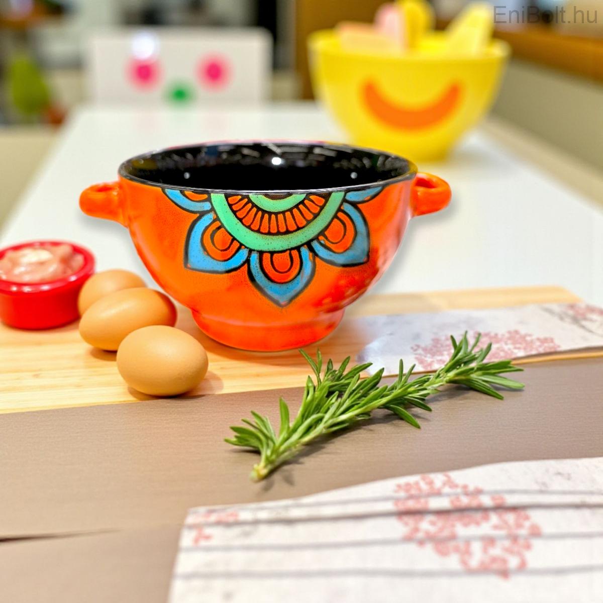 Porcelán leveses tál fogantyúval mandala mintával – narancs,fekete 0,65 L