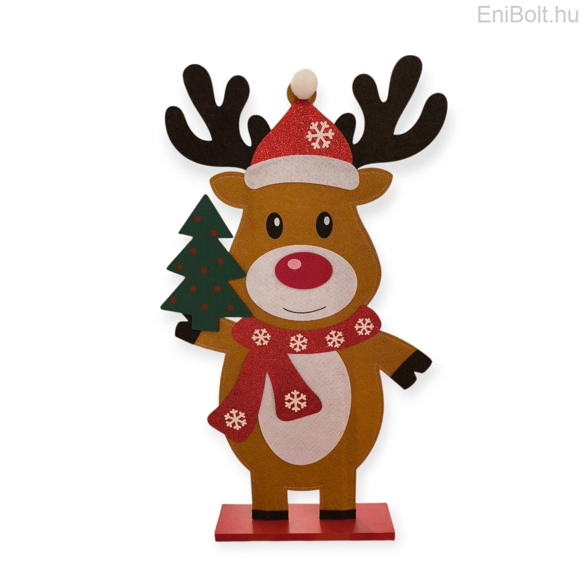 Rénszarvas filc dekoráció piros sállal és zöld fával 64 cm