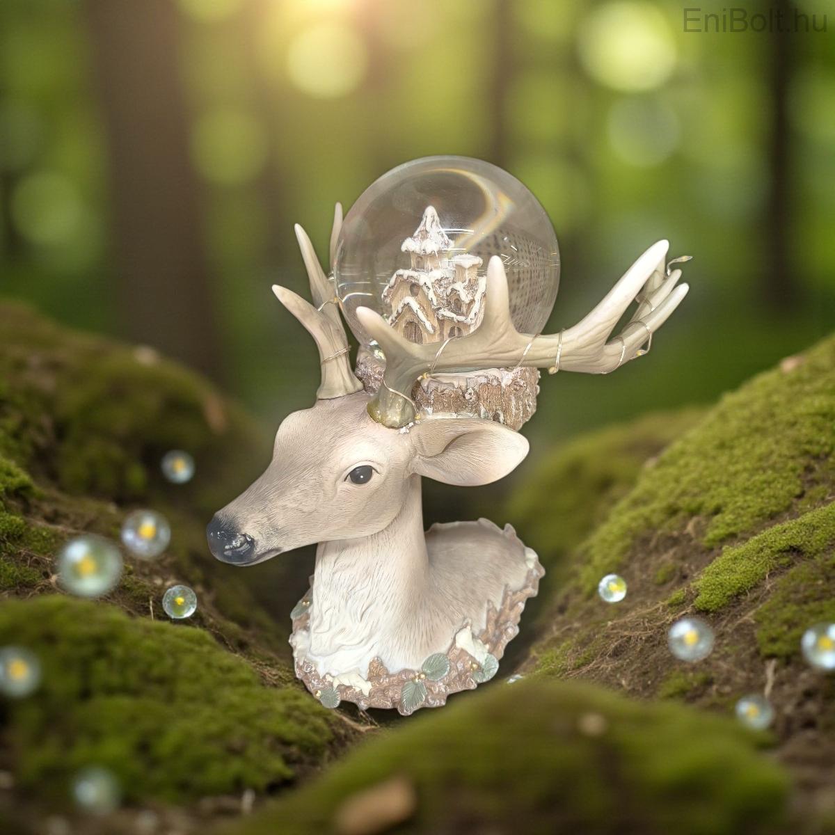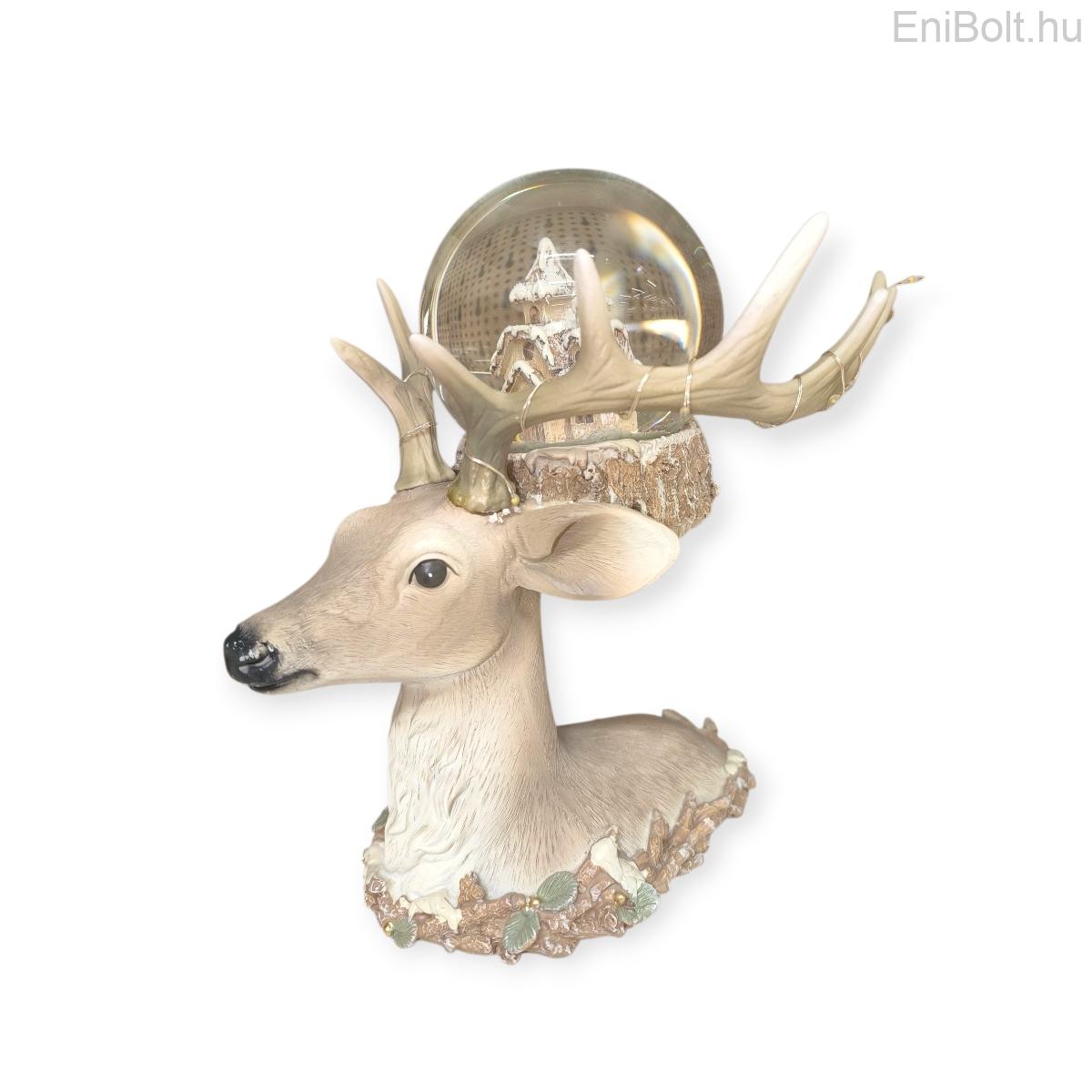 Ez a különleges rénszarvasfej karácsonyi dekoráció lenyűgöző látványt nyújt az ünnepi asztalon vagy polcon. Valósághű kidolgozású figura, puha szőrmével és finom arcrészletekkel. A szarvakat LED-es fényfüzér és egy folyékony üveggömb díszíti, amelyben havas ház jelenik meg, varázslatos téli hangulatot teremtve.