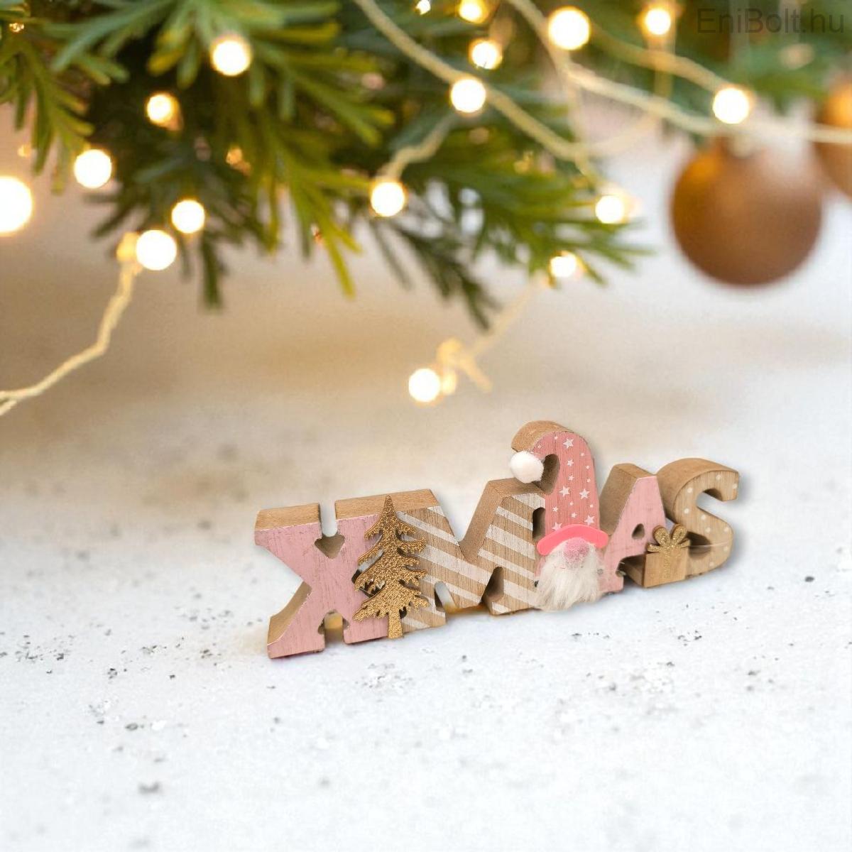 Fa karácsonyi asztaldísz XMAS felirattal, arany csillogó fenyőfával, ajándékkal és rózsaszín sapkás manóval.