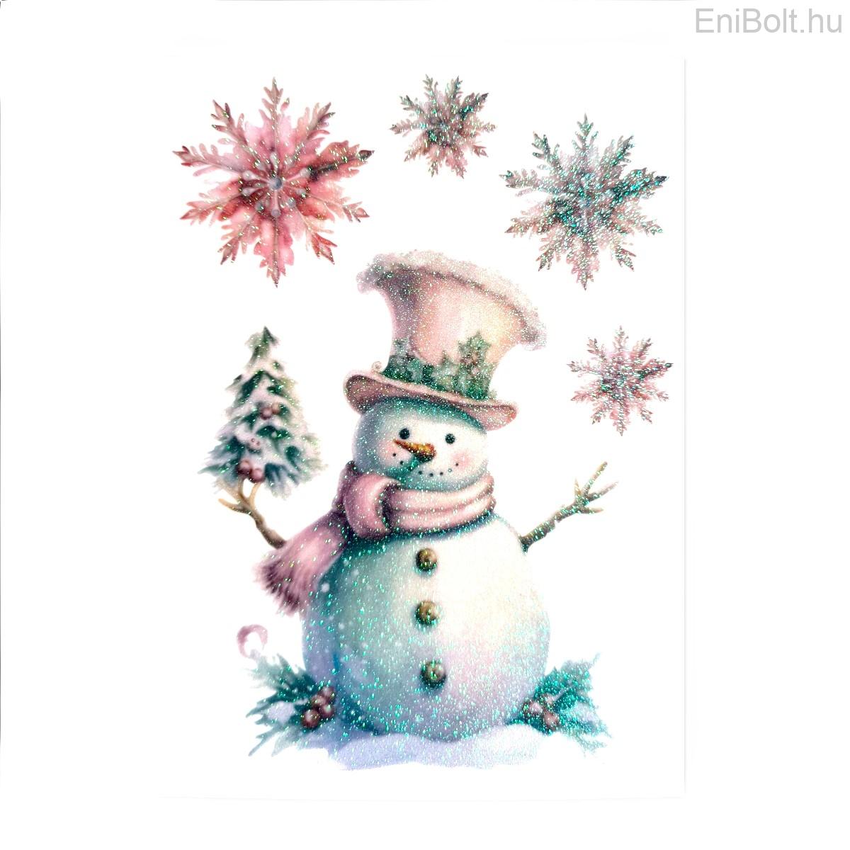 Rózsaszín csillámos hóemberes karácsonyi ablakmatrica – 20×27 cm
