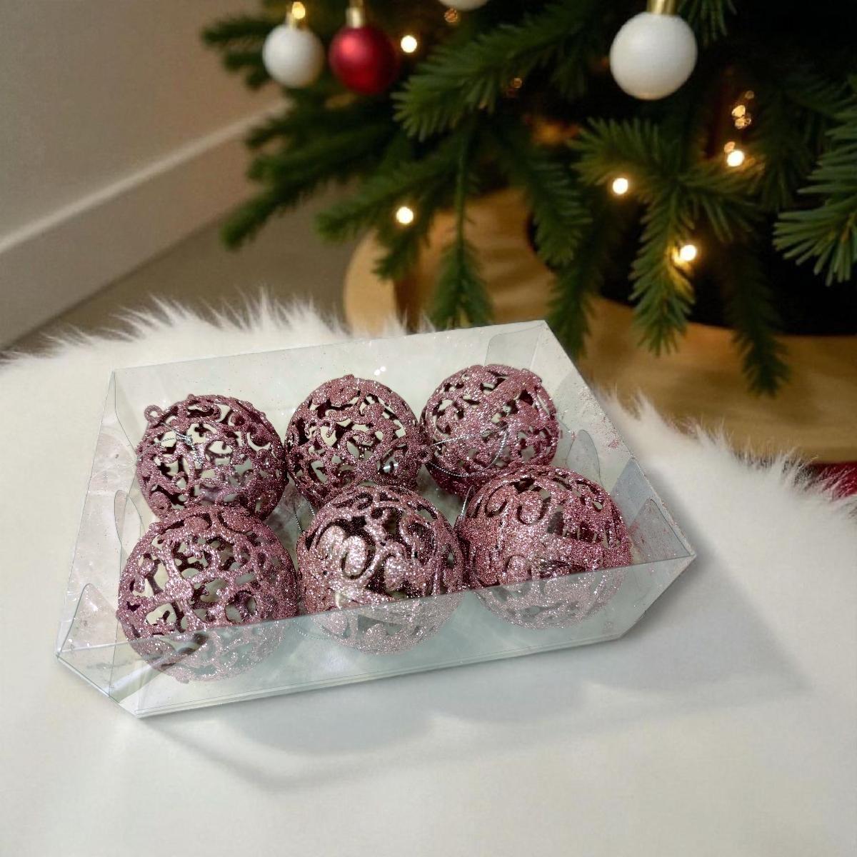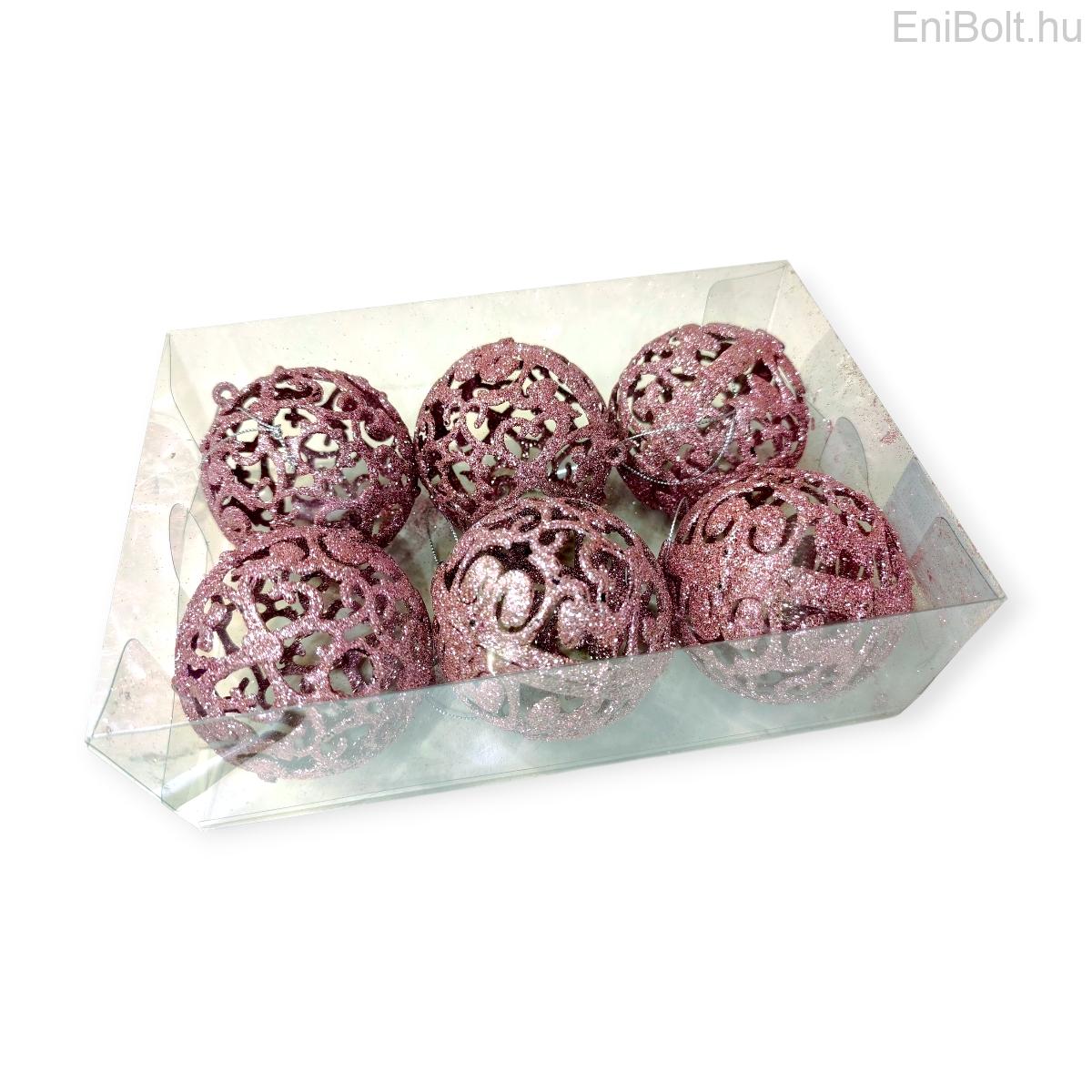 Rózsaszín csipkés csillámos karácsonyi gömb szett 8cm - 6db
