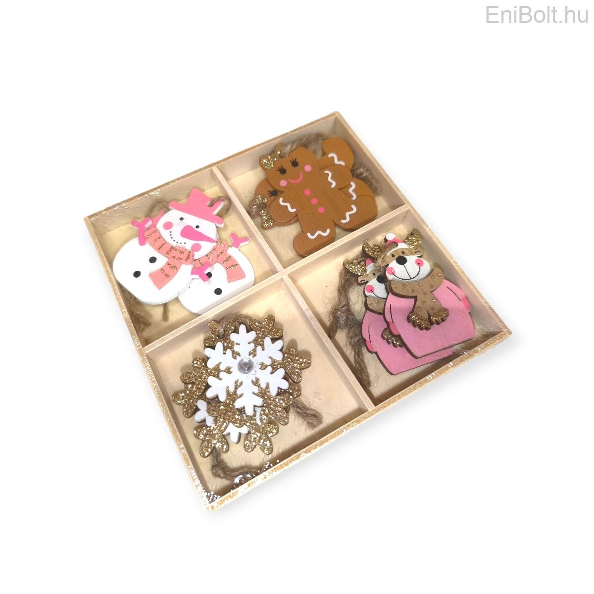 Rózsaszín fa karácsonyfadísz szett – hóember, szarvas, keksz és hópehely (8 db, 4–5 cm)