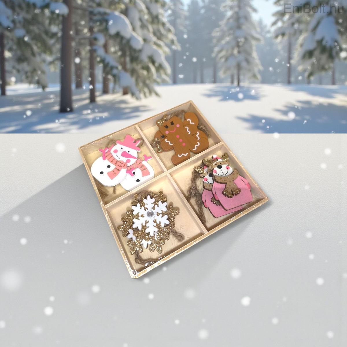 Arany részletekkel díszített fa karácsonyfadísz szett, bájos téli figurákkal: rózsaszín szarvas, sálas hóember, mézeskalács-szerű sütemény és hópehely. Tökéletes választás édes, meghitt karácsonyi hangulathoz, akár karácsonyfán, koszorún vagy ajándékok díszítésére is.